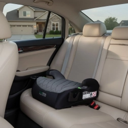 Die Sitzerhöhung bringt das Kind auf die richtige Höhe, damit der Dreipunktgurt sicher über Schulter und Becken verläuft. Die i-Size-Zertifizierung (ECE R129/03) gewährleistet geprüften Schutz.