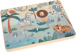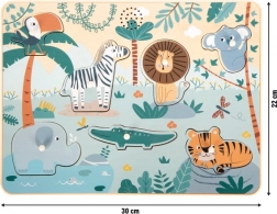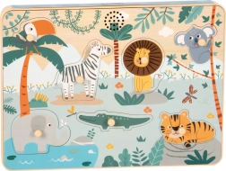 Das hölzerne Einlegepuzzle mit Sound macht frühes Lernen zum Abenteuer. Kinder platzieren Löwe, Tiger, Elefant, Zebra, Koala, Tukan und Krokodil an die richtige Stelle und hören beim Anheben des Teils den authentischen Tierlaut. Die hochwertige Verarbeitung aus FSC®-zertifiziertem Holz ist angenehm anzufassen und umweltfreundlich.