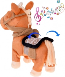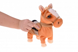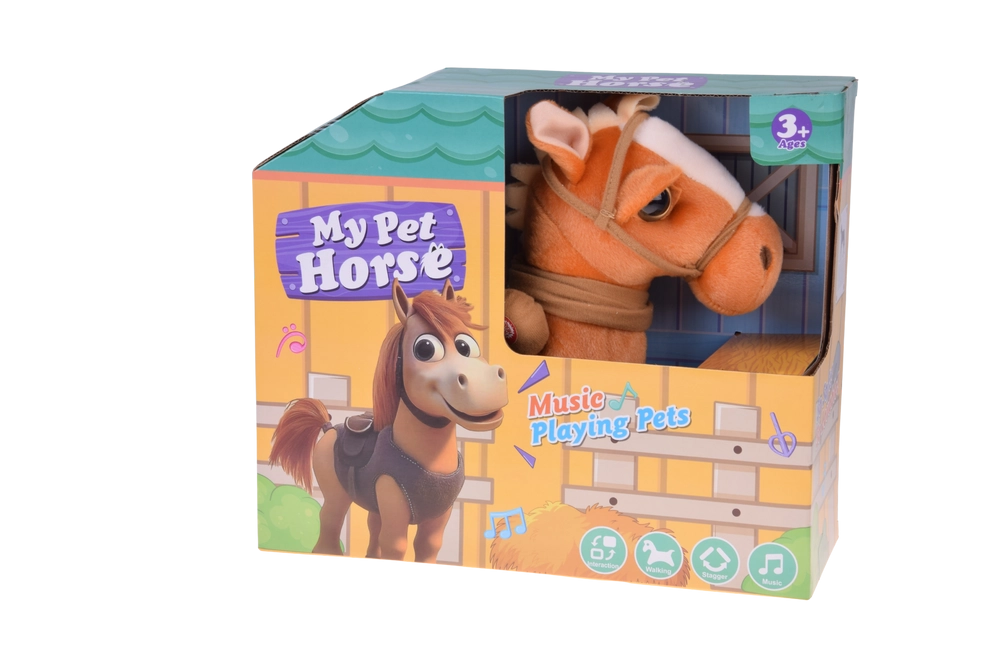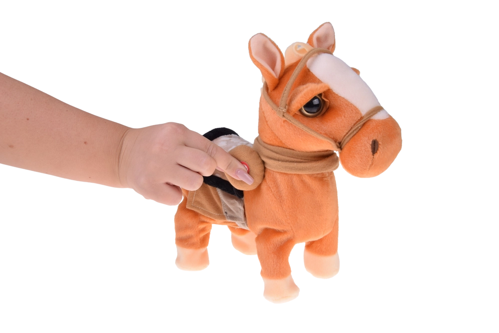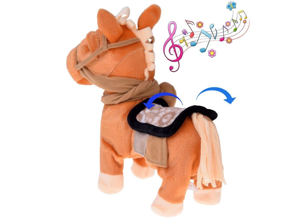 Nach dem Drücken des Knopfes erwacht das Pony zum Leben: Es stellt sich breitbeinig hin, läuft und zeigt einen lustigen Tanz, begleitet von Country-Musik – garantiert gute Laune.
