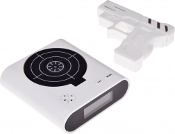 Das Gerät verfügt über ein übersichtliches LCD-Display und eine flexible Stromversorgung: Es funktioniert mit AA-Batterien oder über Micro-USB (Kabel nicht enthalten). Im Lieferumfang sind der Wecker mit Zielscheibe und die IR-Pistole enthalten; das Ganze ist in einem Kartonkarton verpackt – ideal als Geschenk.