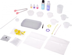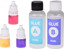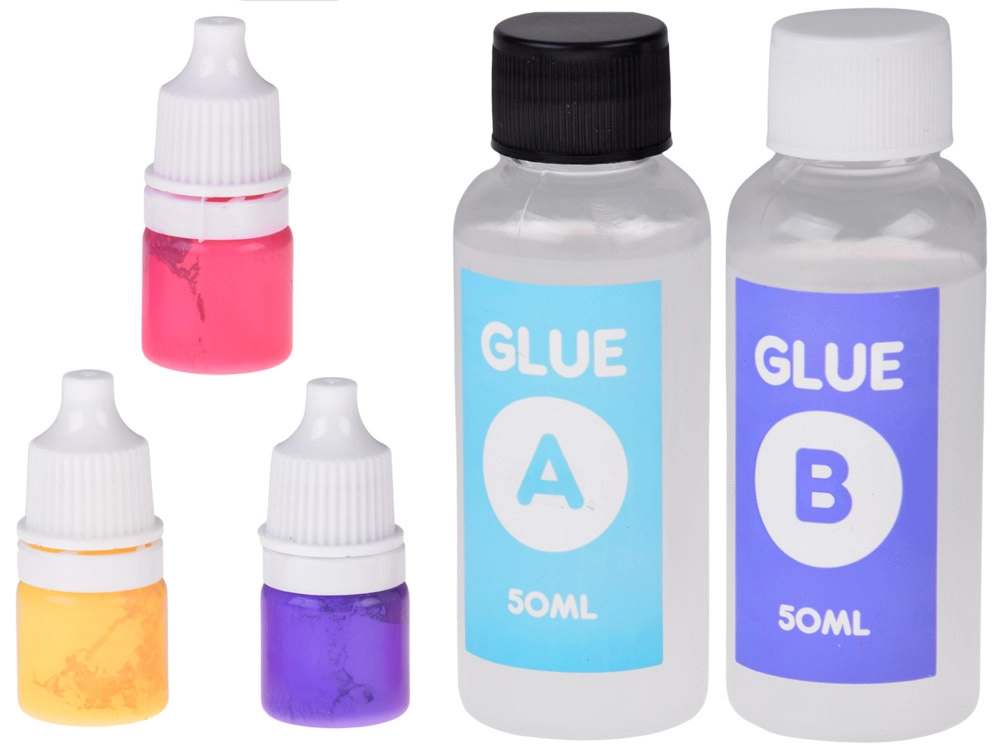 Das Set enthält Messbecher, Schalen, Lösungen A und B, Farbstoffe, Stäbchen, Perlen und Beutel – alles, was du zum Mischen, Färben, Verzieren und Aufbewahren des Schleims brauchst.