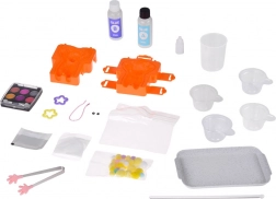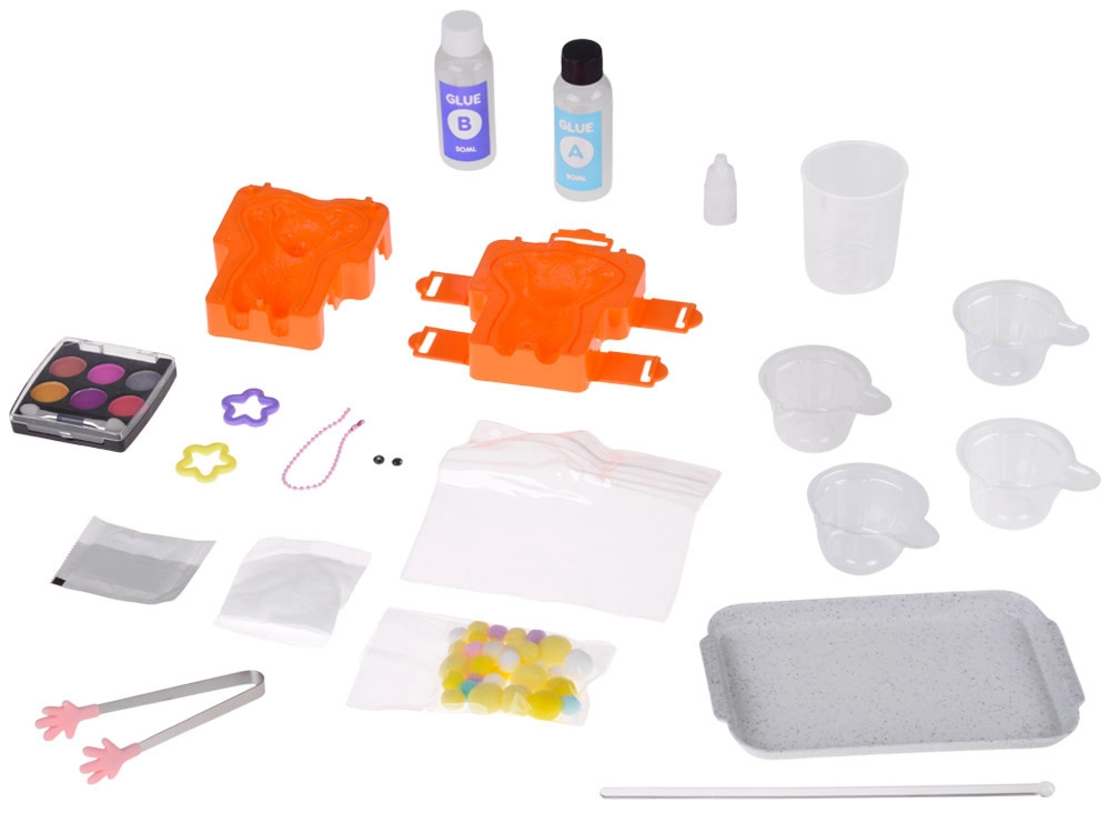 Das Set enthält eine Form, kleine Zangen, einen Rührstab, Kleber, Pigment, weiche Kügelchen, Sternchen, Wackelaugen, einen Zierbeutel, eine Kette und mehr – Sie können sofort loslegen.