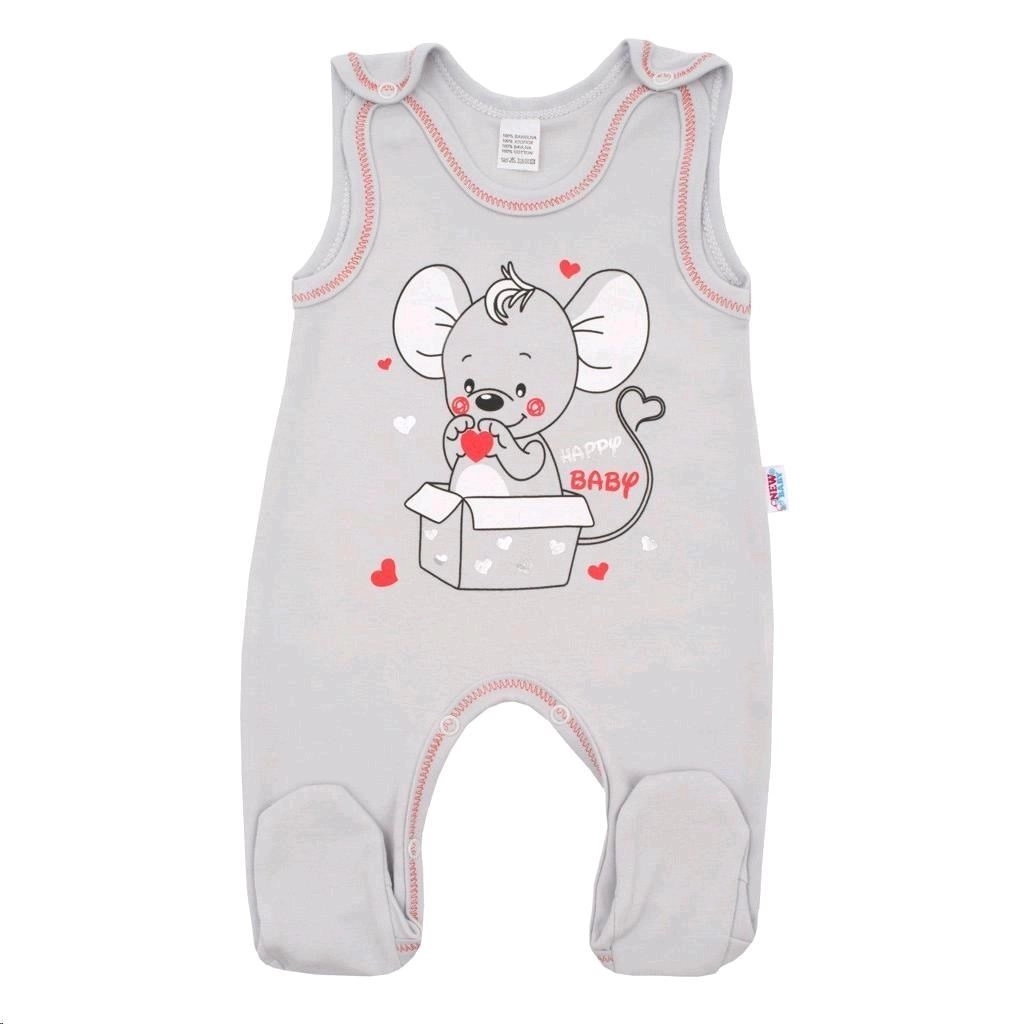 Das Set ist in einem zarten Grauton mit farbiger Einfassung und einem großen Maus-Print gestaltet, der dem Outfit einen verspielten Look verleiht. Das Produkt stammt von der tschechischen Marke NEW BABY, die besonderen Wert auf Qualität und Komfort für Babys legt.