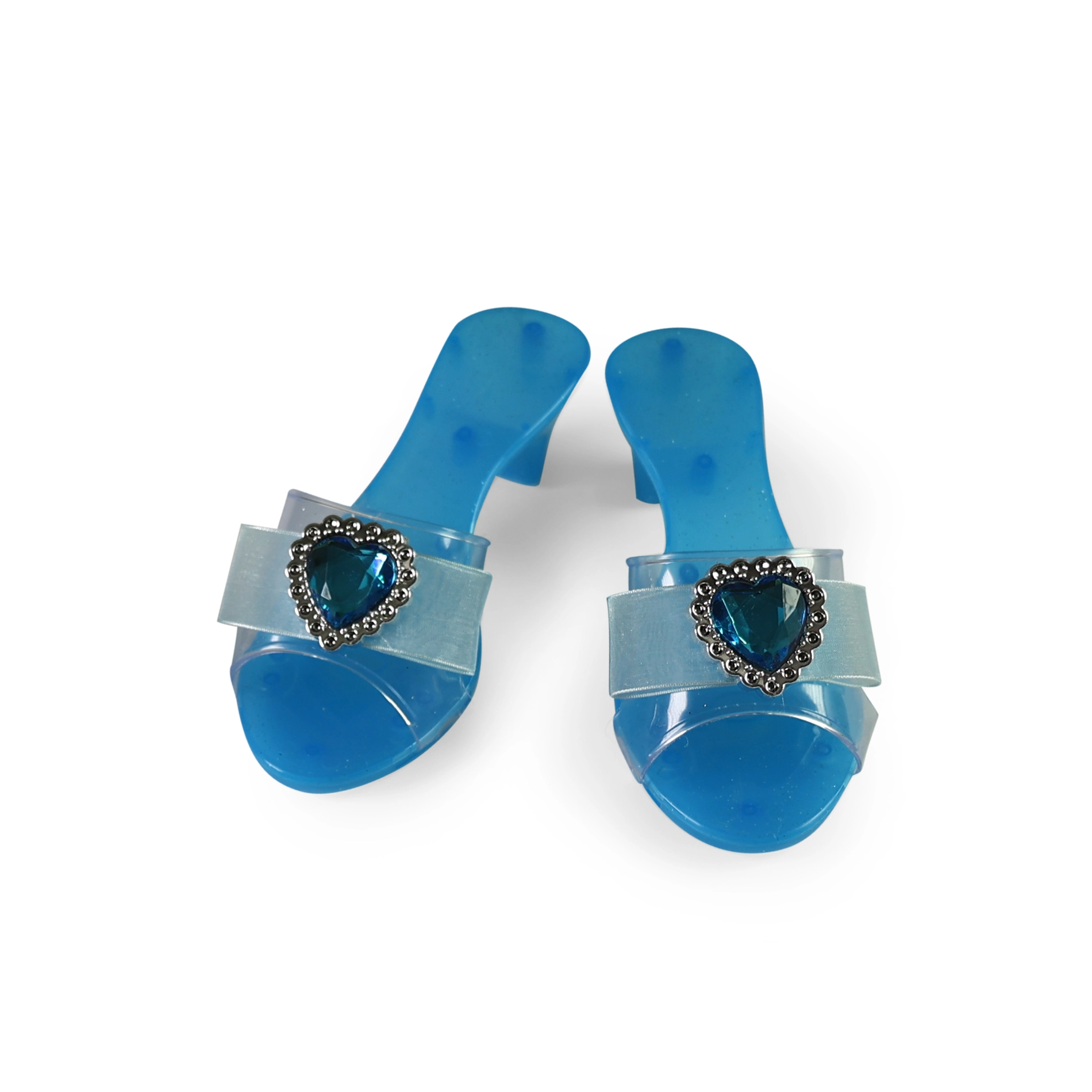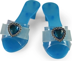 Leichte Kunststoffschuhe mit transparentem Riemchen und blauem Herzstein lassen sich leicht anziehen und ergänzen jedes Kostüm perfekt.