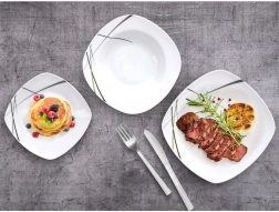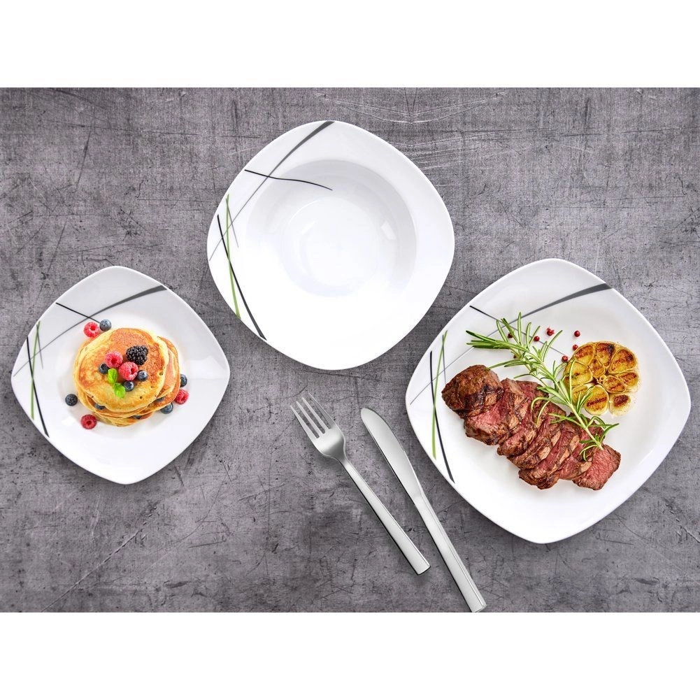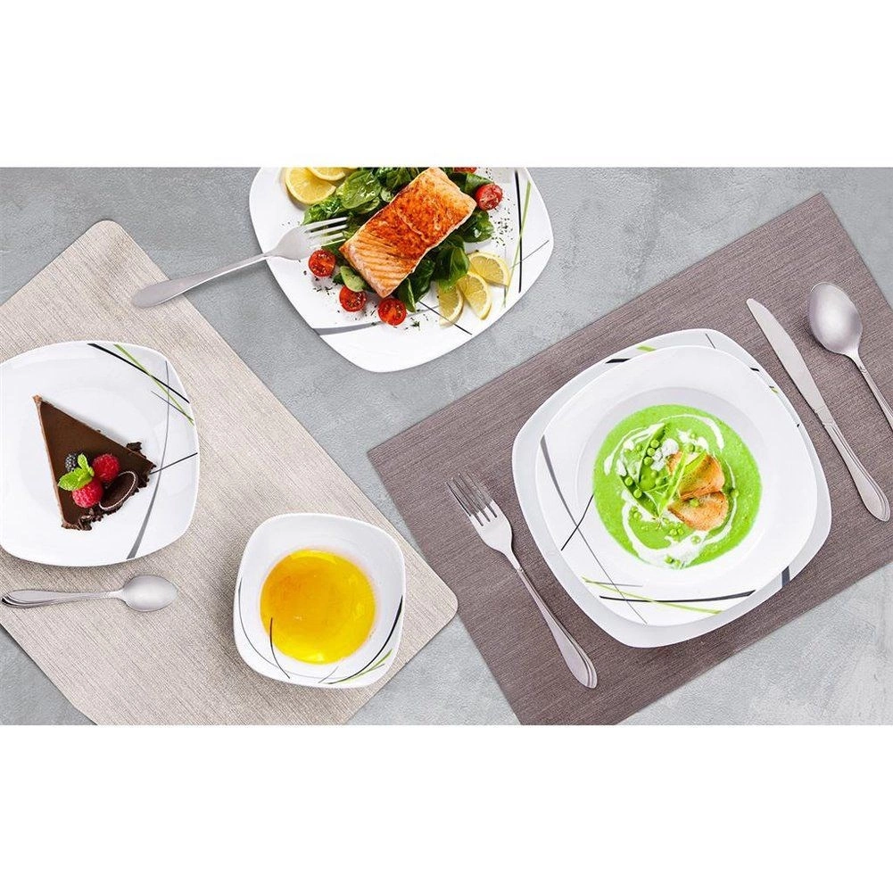 Dieses quadratische Tafelservice aus hochwertigem Porzellan bringt Stil und Praktikabilität in jeden Haushalt. Das moderne Dekor in Grün, Schwarz und Grau kommt auf dem Tisch wunderschön zur Geltung und lässt sich leicht mit weiterer Ausstattung kombinieren. Ideal für Frühstück, Mittag- und Abendessen sowie perfekt für Familientreffen und festliche Tafeln.