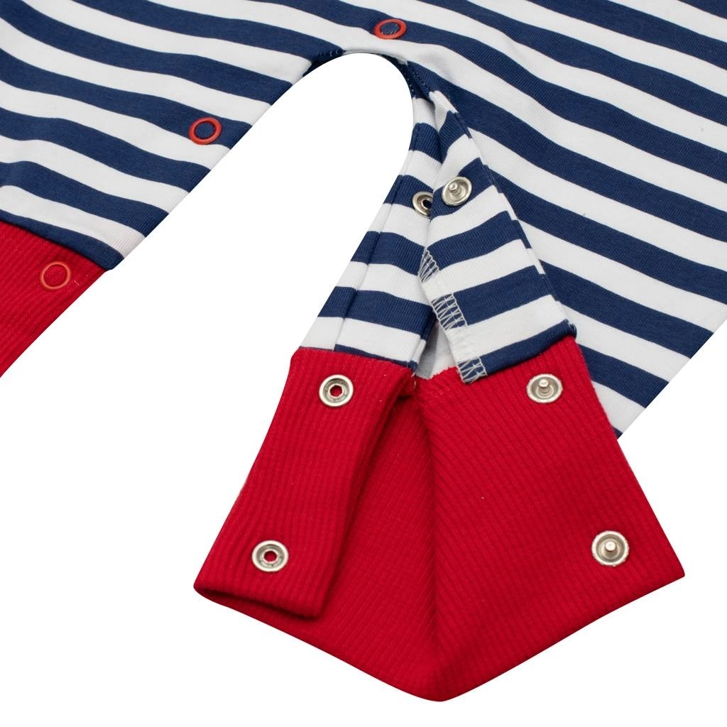 Der Jungen-Sommerstrampler New Baby Marine ist die ideale Wahl für warme Tage. Leichte und atmungsaktive reine Baumwolle sorgt für maximalen Komfort, während das moderne Streifendesign und die niedliche Boot-Applikation dem Outfit einen maritimen Touch verleihen. Die Applikation ist auf der Innenseite mit Stoff unterlegt, damit sie die empfindliche Haut nicht reizt.