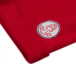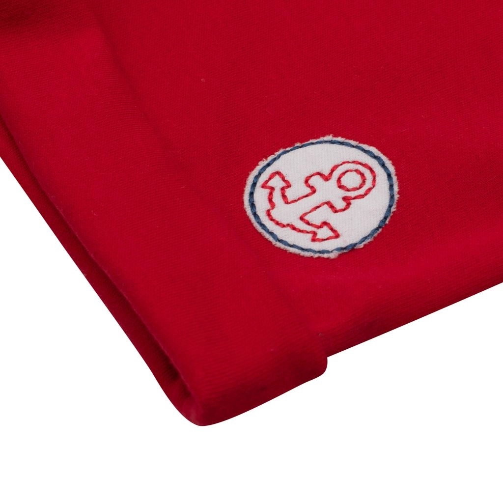 Gestreiftes T-Shirt mit Boots-Applikation und rote Shorts bilden ein stylisches Set für kleine Matrosen.
