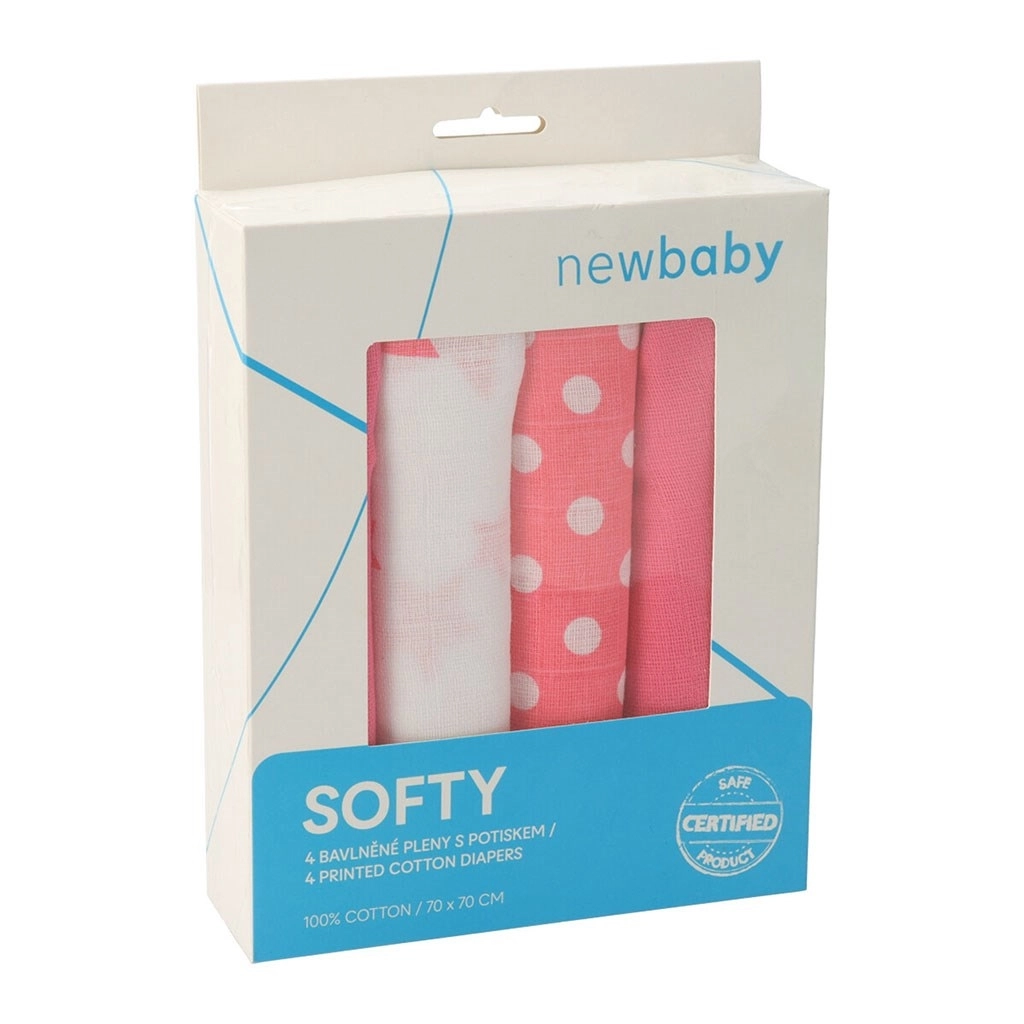 Stoffwindeln aus Baumwolle New Baby Softy mit Aufdruck 70 × 70 cm, 4 Stk., rosa‑weiß