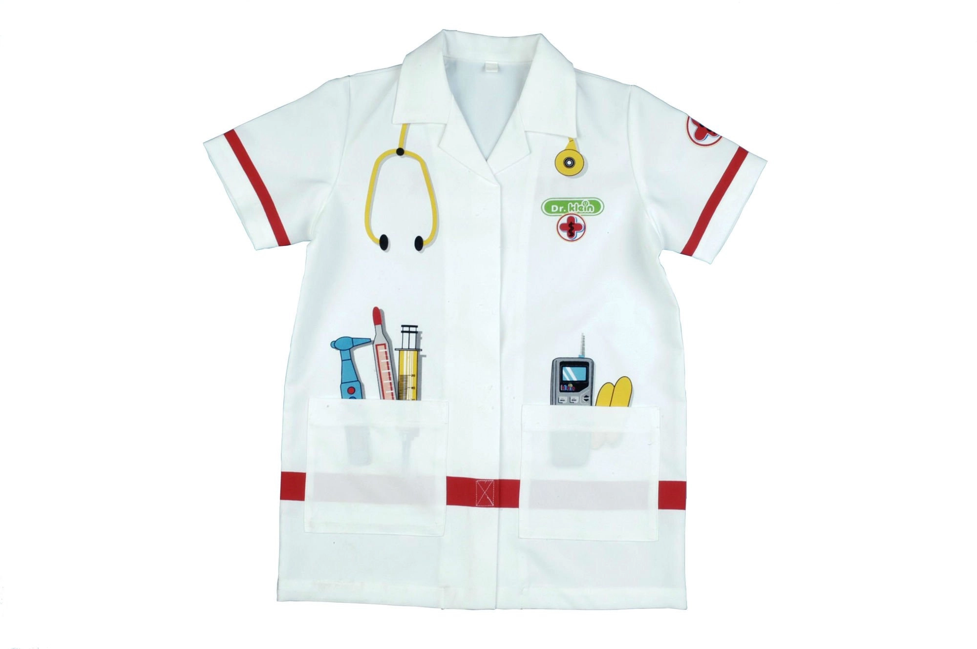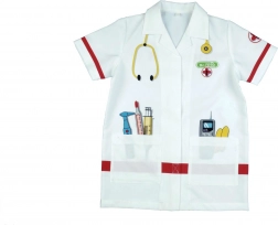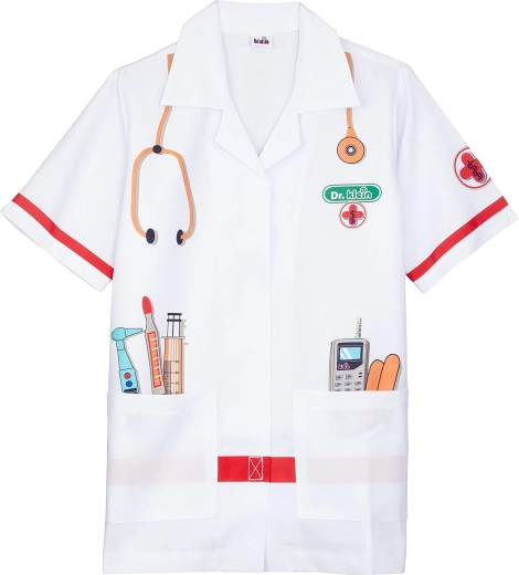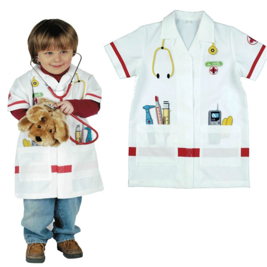 Der Kinder-Arztkittel KLEIN regt die Fantasie an und fördert soziale Fähigkeiten beim Doktorspiel. Leichter und bequemer Schnitt mit Kragen, kurzen Ärmeln und Klettverschluss ermöglicht einfaches An- und Ausziehen. Bunte Instrumentenaufdrucke sorgen für Authentizität und Spielspaß.