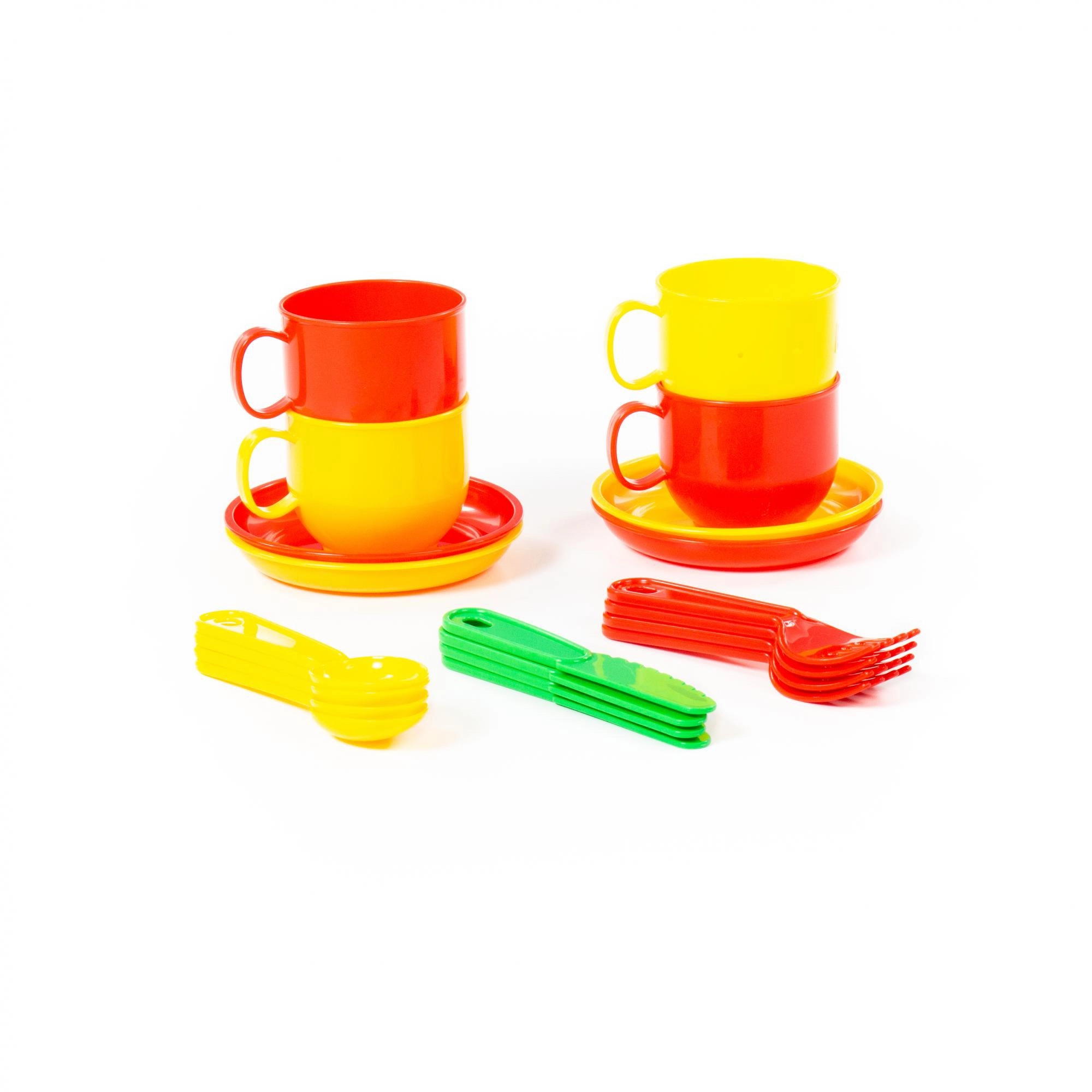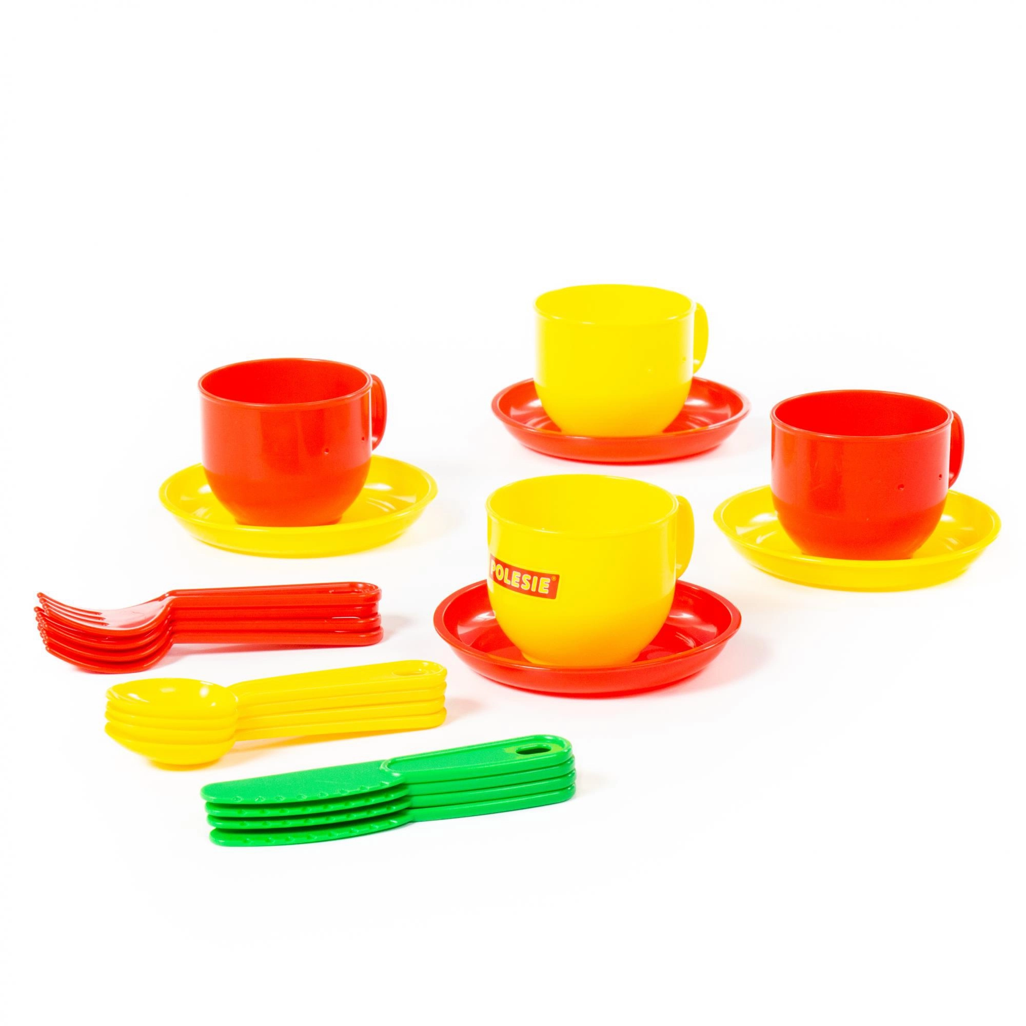 Das Set enthält ein Tablett, 4 Teller, 4 Tassen und Besteck (Löffel, Gabeln, Messer) – alles bereit für Kinderfeste.