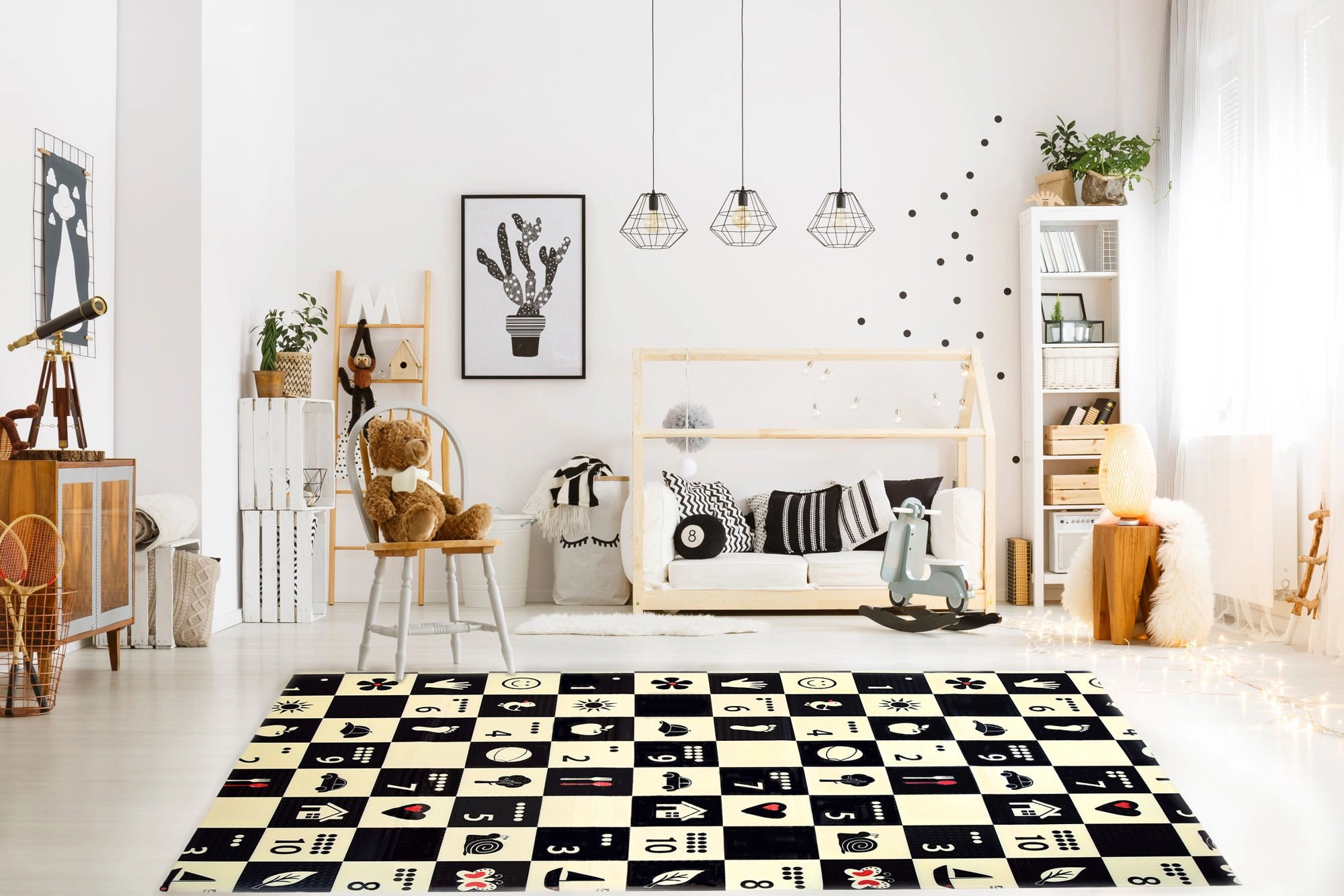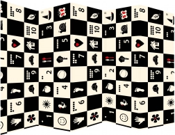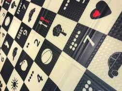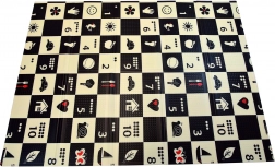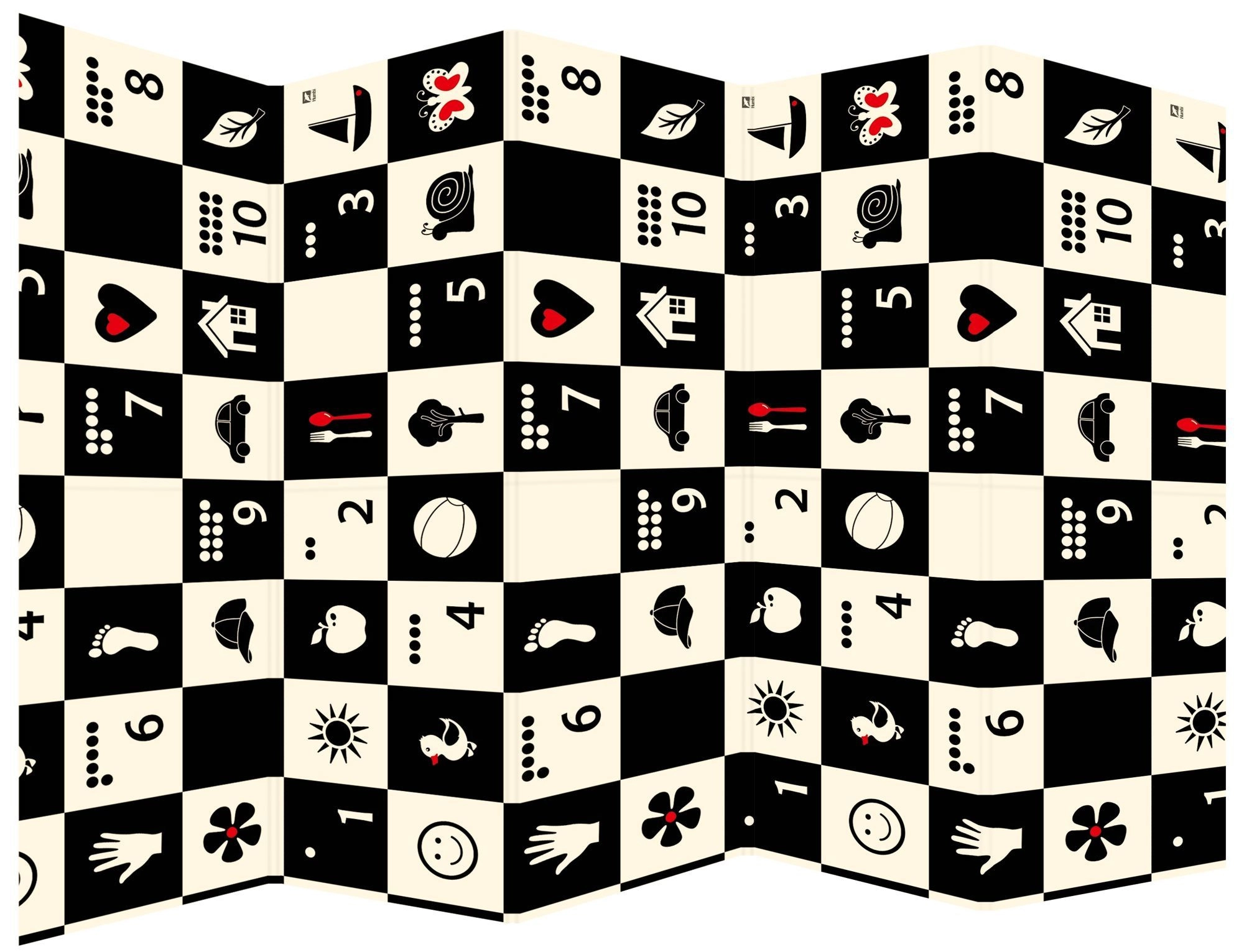 Ein schwarz-weißes Schachbrettmuster mit einfachen Symbolen stimuliert das Sehen, fördert die visuell-räumliche Intelligenz und zieht die Aufmerksamkeit von Babys auf sich.