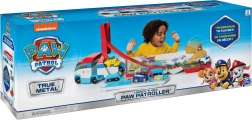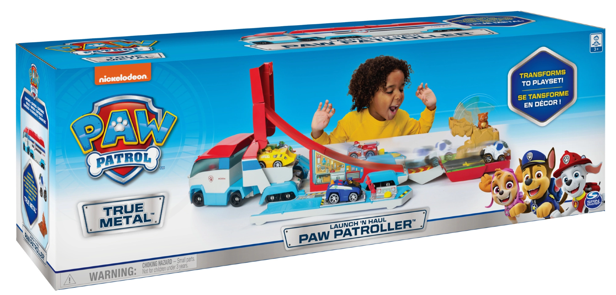 Verwandle dein Kinderzimmer mit dem imposanten 2-in-1-Transporter der PAW Patrol in eine Rettungszentrale. Der robuste weiß-blau-rote Truck mit getönten Fenstern entfaltet sich zu einer großzügigen Spielstation mit Rampe und Abschussvorrichtung, wo Kinder Fahrzeuge ins Rennen schicken, Feuer löschen, Fahrzeuge mit dem Lift hochfahren und einen zwischen Felsen eingeklemmten Bären retten.
