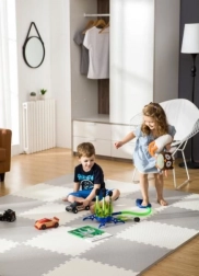 Die Puzzleteile lassen sich miteinander verbinden und die Spielfläche durch Zukauf weiterer Sets desselben Modells erweitern. Randleisten sorgen für einen sauberen Abschluss und bessere Stabilität. Der neutrale Grauton wirkt im Kinderzimmer wie im Wohnzimmer ruhig und ästhetisch. Die Matte ist frei von Phthalaten, Formamid, BPA und PVC, erfüllt EN 71 sowie die Anforderungen von REACH und ist mit CE gekennzeichnet.