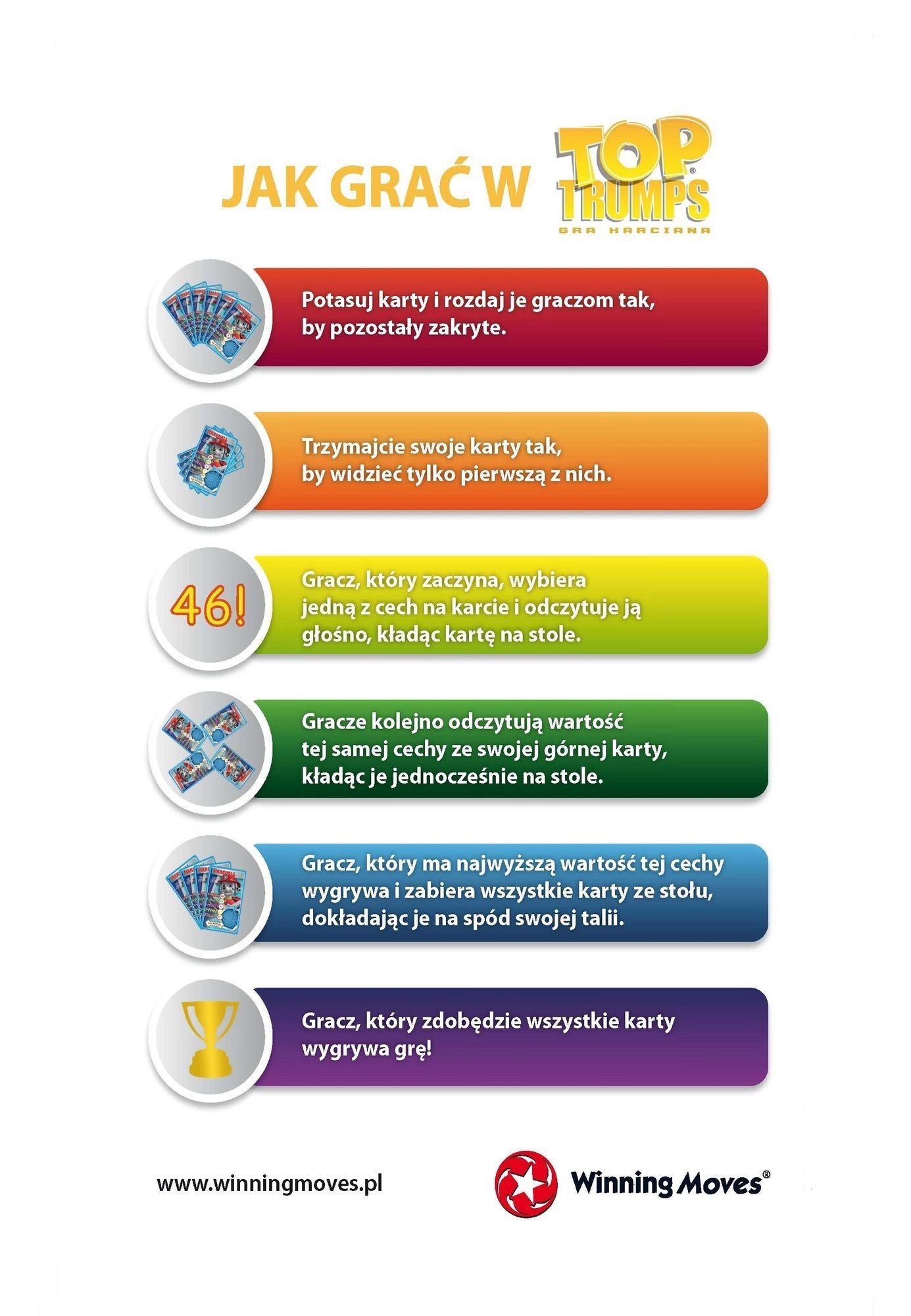 Die Spieler teilen die gemischten Karten aus, schauen sich die oberste an und der aktive Spieler wählt eine der fünf Eigenschaften. Wer den höchsten Wert hat, gewinnt die Karten und spielt weiter, bis einer alle erobert hat. Eine schnelle Runde dauert etwa 15 Minuten – ideal für kurze Pausen, Reisen oder den Familiennachmittag.