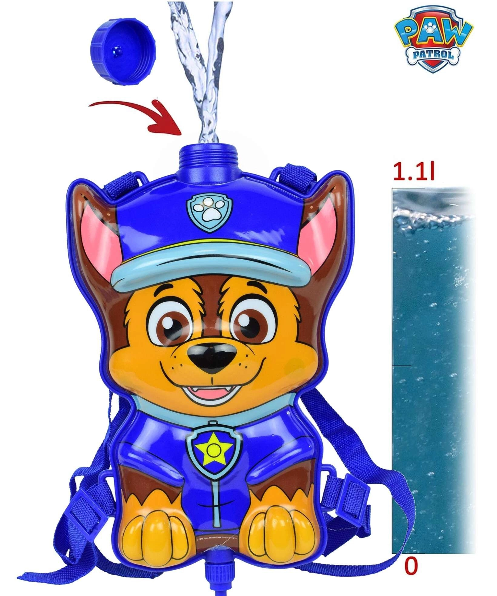 Dieser Kinder-Wasser-Rucksack in Form des beliebten Helden Chase aus dem Cartoon Paw Patrol verwandelt jeden sonnigen Tag in eine tolle Wasserschlacht. Den Tank füllen Sie über die verschließbare Einfüllöffnung, anschließend spritzen Sie über den Schlauch und die Handpumpe einen Wasserstrahl. Dank der verstellbaren Träger sitzt der Rucksack Kindern unterschiedlicher Größe bequem.