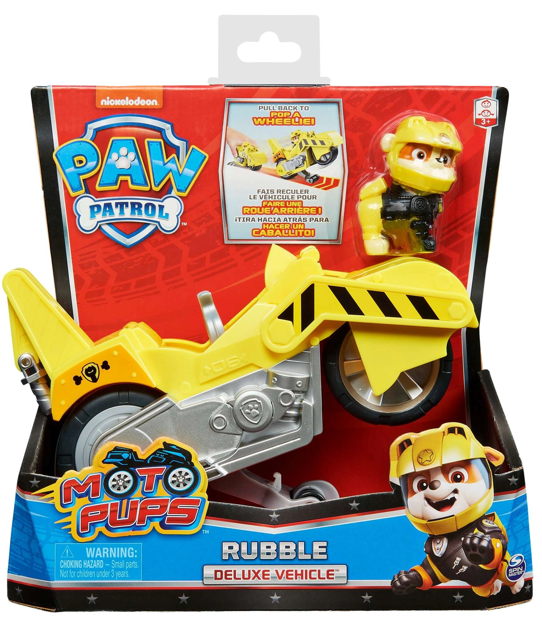 Ab auf die Baustelle oder zur Rettungsmission mit Bulldogge Rubble und seinem gelben Stunt-Motorrad aus der Serie Moto Pups. Robuste Verarbeitung, markante gelbe Details und große Räder sorgen für hervorragende Stabilität, während der Rückziehmechanismus Kindern jede Menge rasanten Spaß bringt.