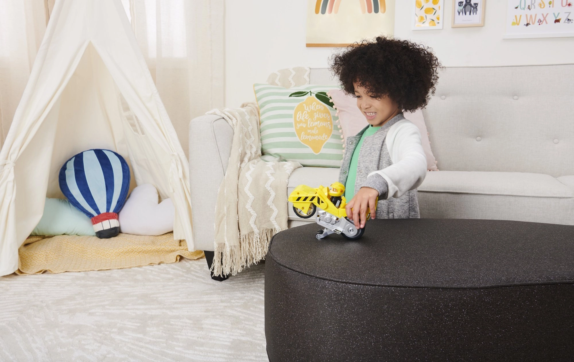 Dank zusätzlicher Stützräder beherrscht das Motorrad eindrucksvolle Wheelies – das Fahren auf dem Hinterrad. Die Rubble-Figur kann in den Sattel gesetzt werden und startet in Abenteuer, die Fantasie, Feinmotorik und die Liebe zu Lieblingshelden fördern.