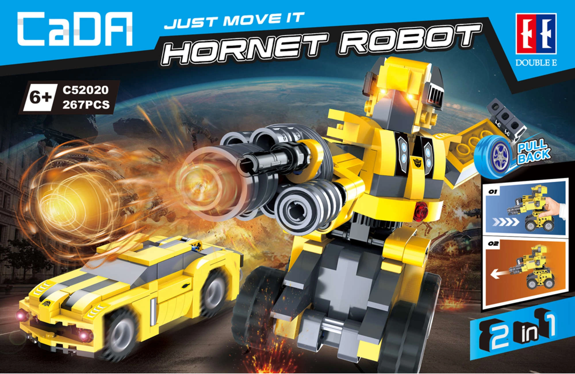 Das CaDA Hornet Bauset aus der Just Move It Serie bietet zwei Baumöglichkeiten in einer Packung: Bauen Sie einen posierbaren Roboter oder ein schnelles Auto mit Pull-Back-Antrieb. Dank der übersichtlichen Anleitung schaffen den Aufbau auch jüngere Baumeister mit Hilfe eines Erwachsenen.