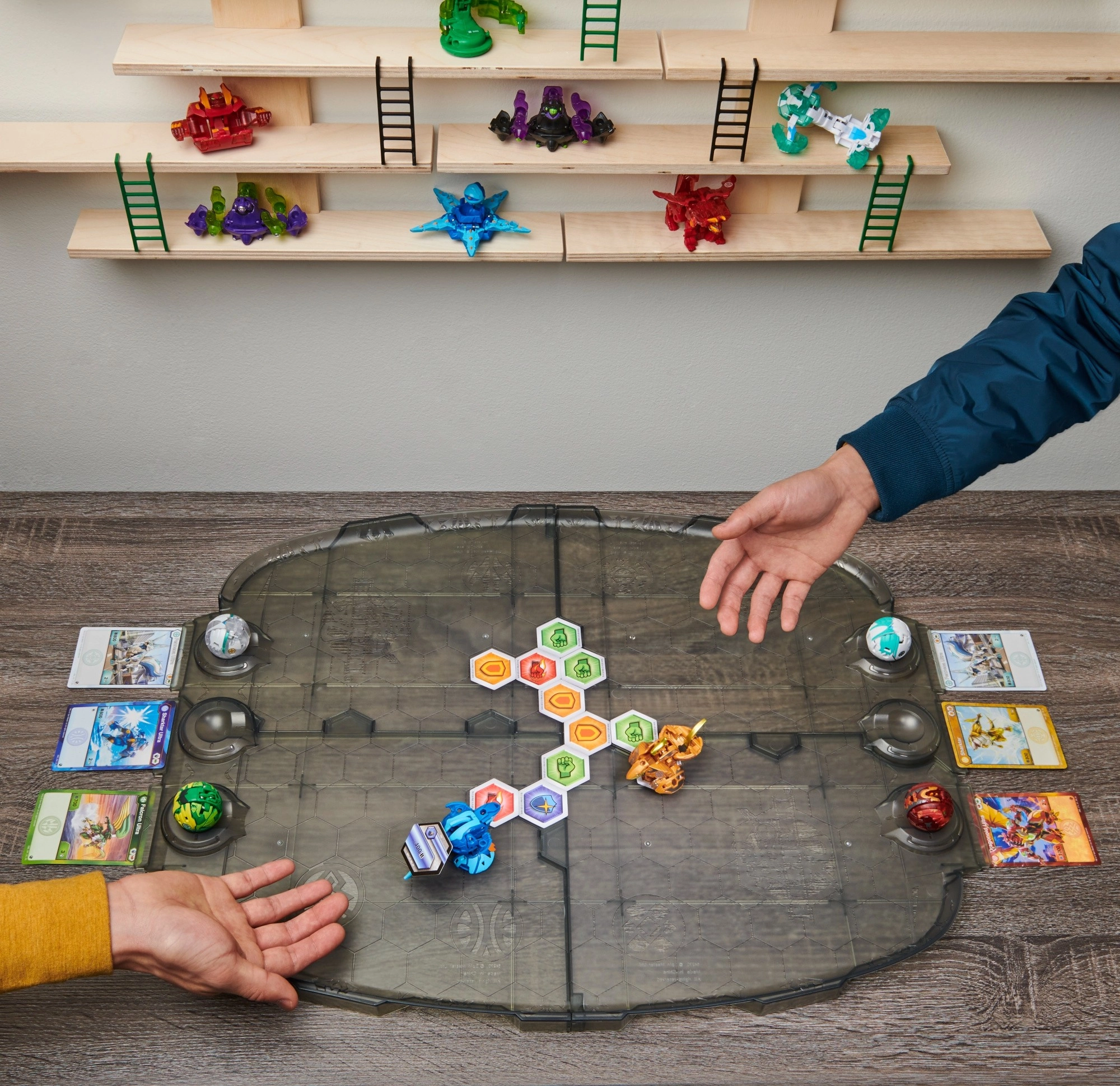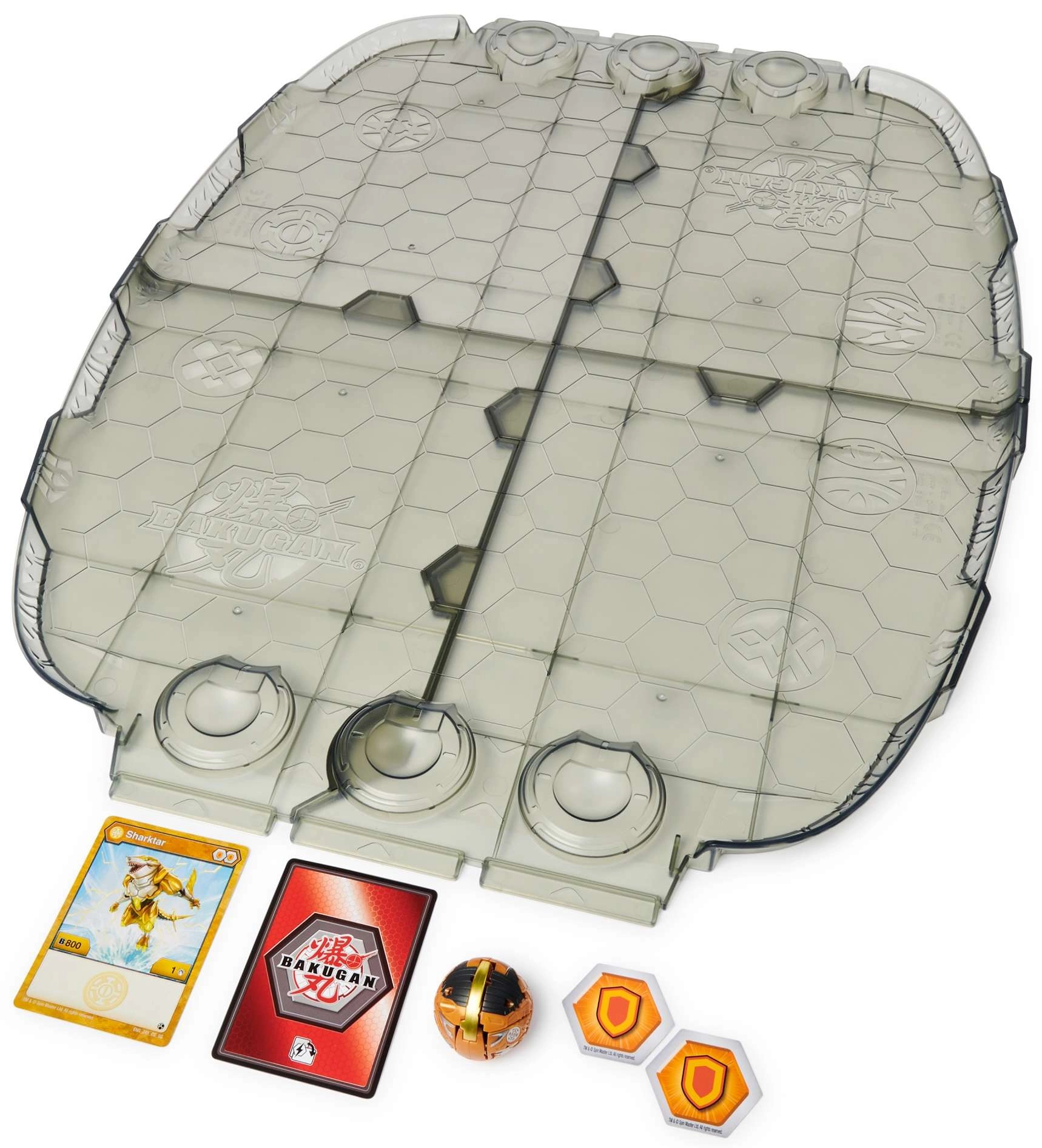 Das robuste, klappbare Spielfeld mit erhöhten Rändern hält BakuCores und Figuren an ihrem Platz. Das Sechseckmuster erleichtert den schnellen Spielaufbau und sorgt für übersichtliche Duelle.