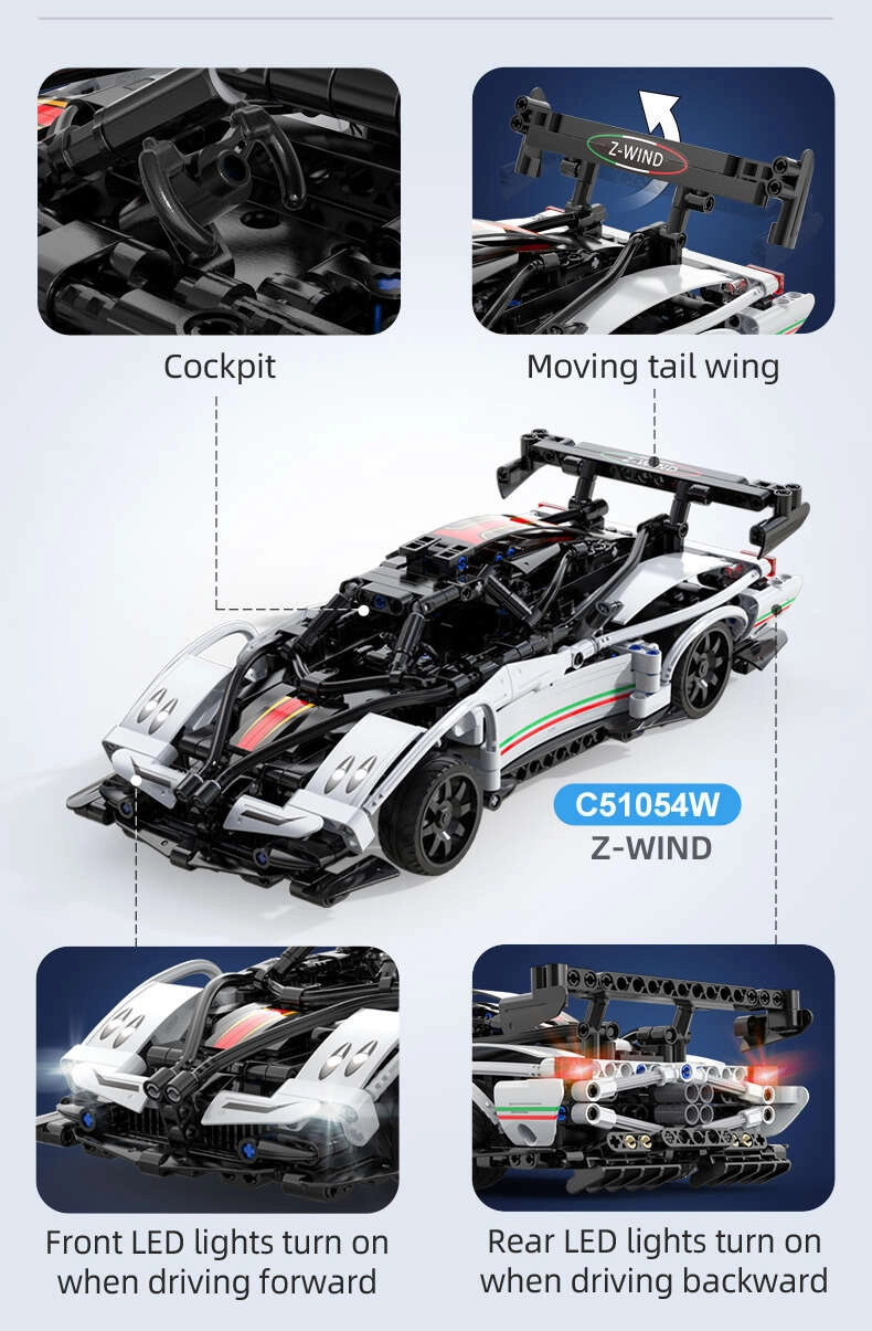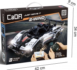 Der CaDA Z-Wind Bausatz verbindet Bauspaß mit der Dynamik eines ferngesteuerten Modells. Die präzise gefertigte Karosserie in Weiß mit schwarzen Akzenten, funktionale LED-Lichter und eine sanfte Fahrt mit bis zu 5,5 km/h machen diesen Rennwagen zu einem beeindruckenden Stück zum Spielen und Ausstellen.
