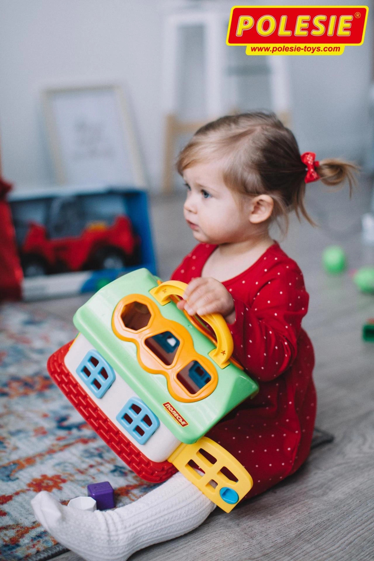 Die Öffnungen im Dach und an den Wänden des Häuschens entsprechen exakt den farbigen Bausteinen – das Kind übt Sortieren, das Unterscheiden von Formen und die Auge-Hand-Koordination.