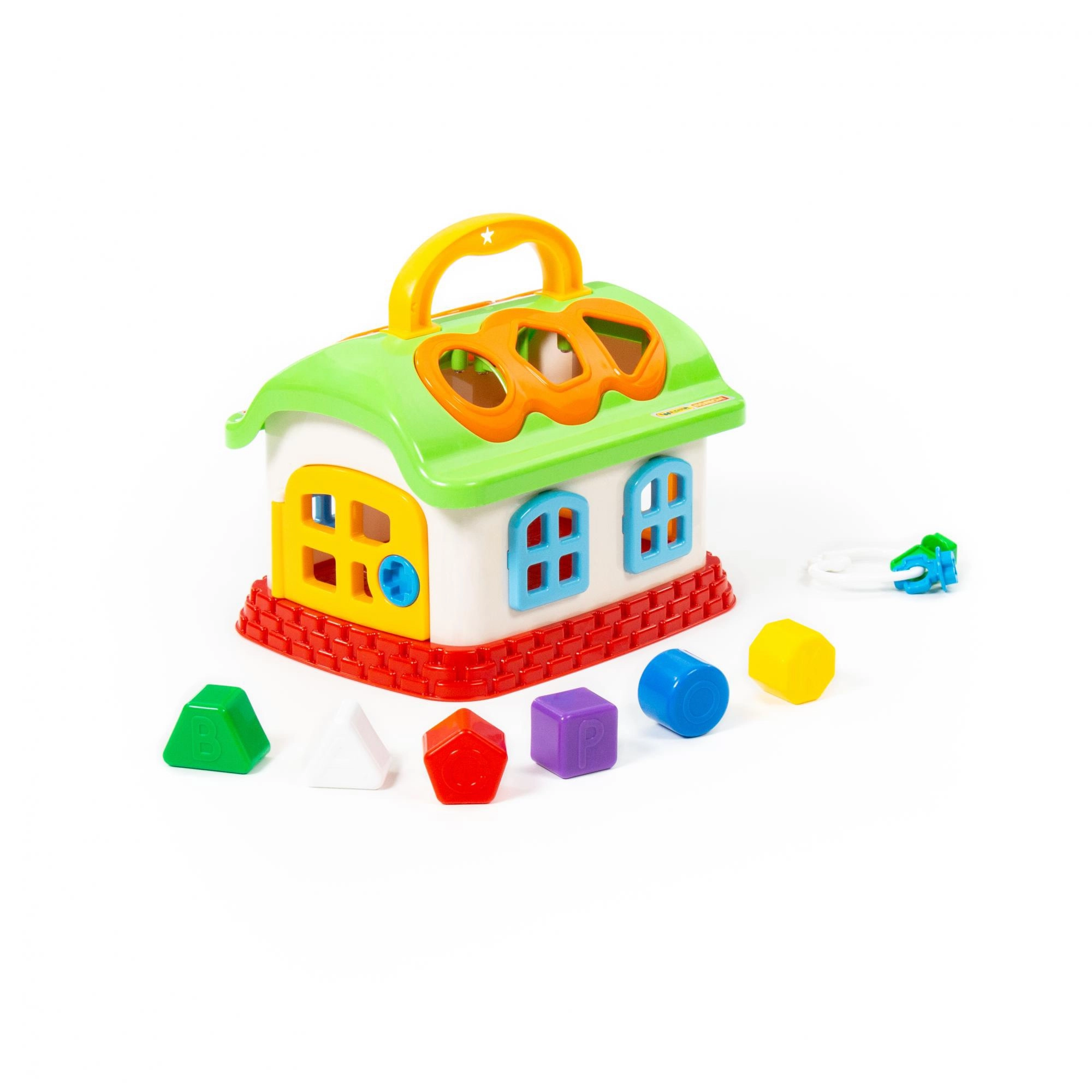 Das Dach und die Wände des Häuschens enthalten Öffnungen zum Einsetzen farbiger geometrischer Blöcke. Die Türchen lassen sich aufschließen, was zusätzlichen Spaß und Lerneffekte bringt. Ein ideales Hilfsmittel zur Förderung der Feinmotorik, zum Training von Geduld und zur Unterscheidung von Farben.