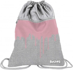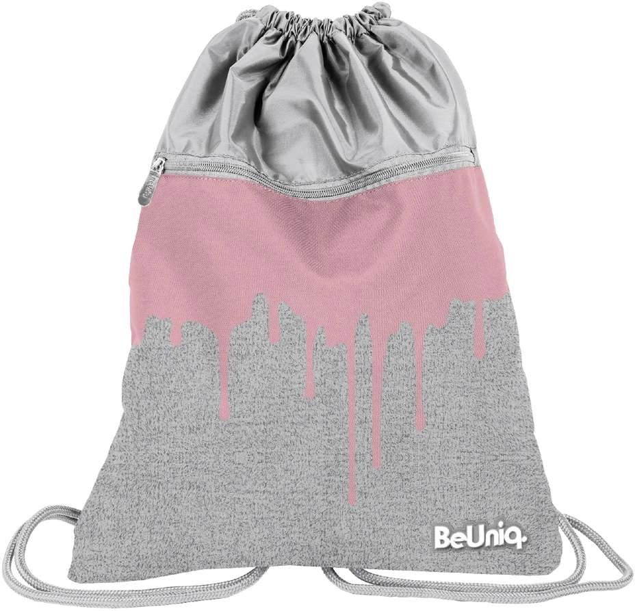 Das grau‑rosa Drip‑Design mit BeUniq‑Logo verbindet modernen Look mit verstärktem Rücken und starken Kordeln für bequemes Tragen.