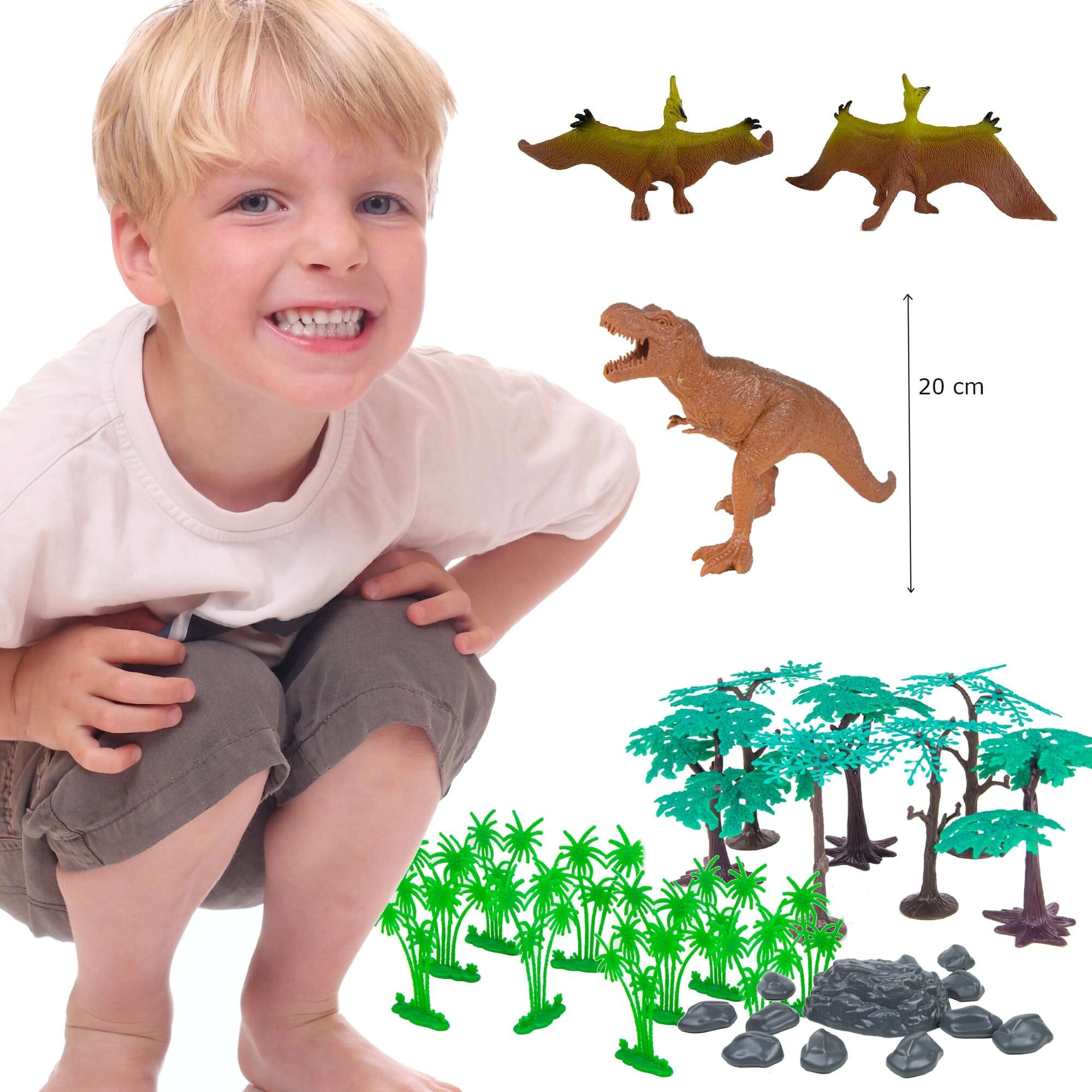 Vier große Figuren (inklusive T‑Rex und Pterosaurier), sieben mittelgroße, sechzehn kleine sowie Bäume und Felsen. Gestalten Sie Ihre eigene Urzeitlandschaft und erzählen Sie Geschichten.