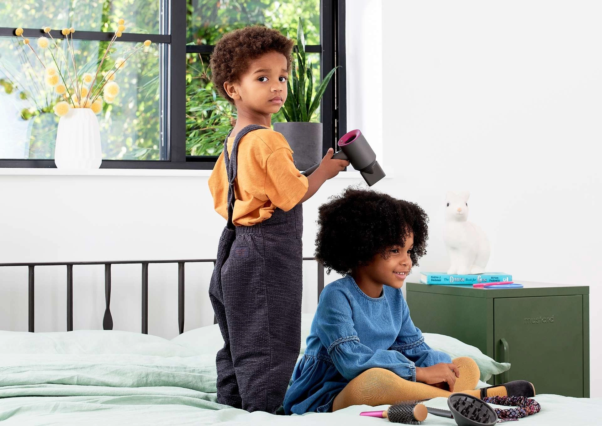 Im Set enthalten sind ein Konzentrator für präzises Styling und ein Diffusor für sanftes Trocknen und zum Betonen von Wellen. Kinder probieren unterschiedliche Haarstyling-Techniken aus.