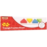 Vier farbige Sets aus Dreiecken auf einer Holzgrundplatte führen Kinder an das Prinzip von Teil und Ganzem heran. Ideal für die erste Begegnung mit Brüchen – ganz ohne Druck.