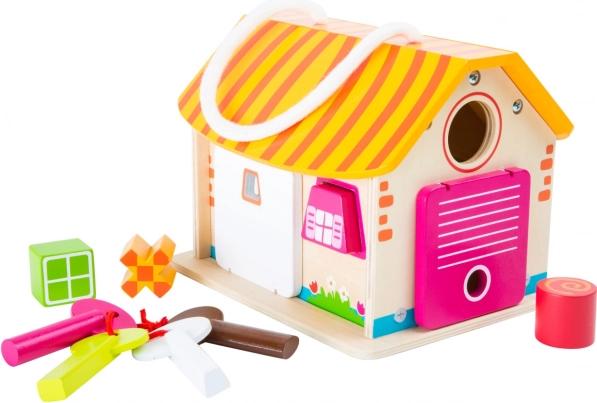 Dieses Holzhaus ist hervorragend zum Üben der motorischen Fähigkeiten von Kindern. Jeder Schlüssel passt zu einer anderen Tür. Dank der Gummibänder bleiben sie geöffnet. Die Bausteine haben verschiedene Formen, die in die richtige Öffnung eingesetzt werden müssen. Zum Transport des Häuschens dient eine Schnur. Hauptmerkmale: enthält 9 Teile, fördert motorische Fähigkeiten, bunte Ausführung
