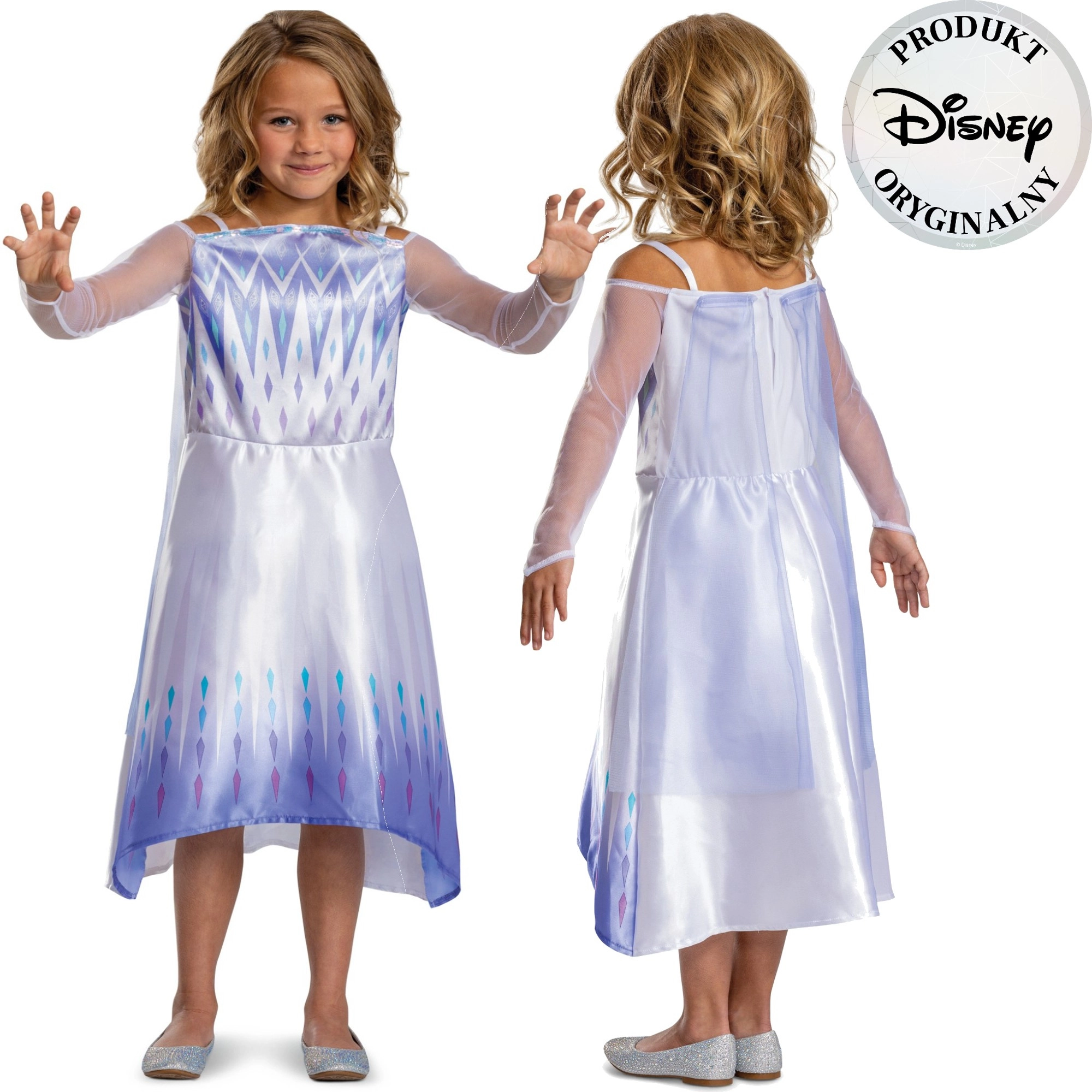 Das Oberteil ist mit geometrischen „eisigen“ Motiven und einem zarten Glitzer versehen, der dem Kostüm den authentischen Look der beliebten Figur aus Frozen verleiht.