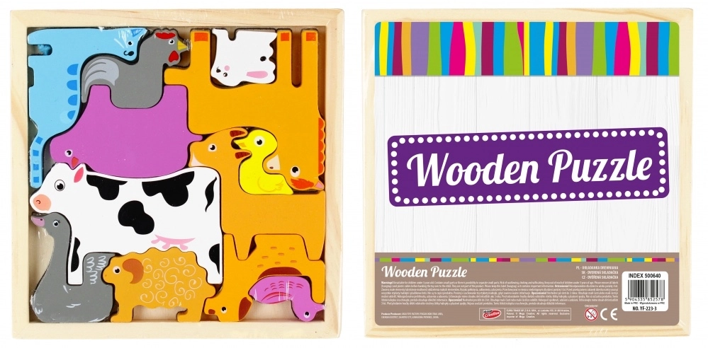 Alles ist in einem praktischen Holzrahmen mit den Maßen 17 × 17 × 2 cm untergebracht, der das Puzzle zusammenhält und das Verstauen erleichtert. Das Spielzeug benötigt keine Batterien und bietet hochwertige, bildschirmfreie Beschäftigung.