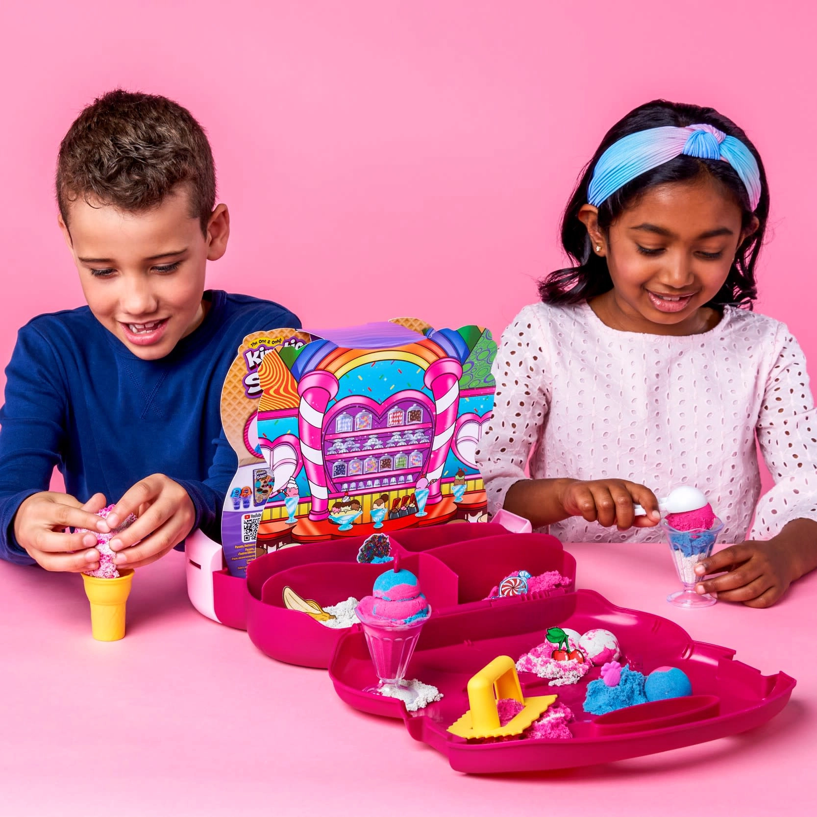 Entdecken Sie kreativen Spielspaß mit duftendem Kinetic Sand im praktischen Koffer. Drei Farben (insgesamt 680 g) und reichlich Zubehör und Formen verwandeln das Spiel in die Herstellung köstlich aussehender „Eiscreme“-Desserts. Der Sand trocknet nie aus, schmutzt nicht und lässt sich leicht aufräumen – ideal für Kinder ab 3 Jahren.