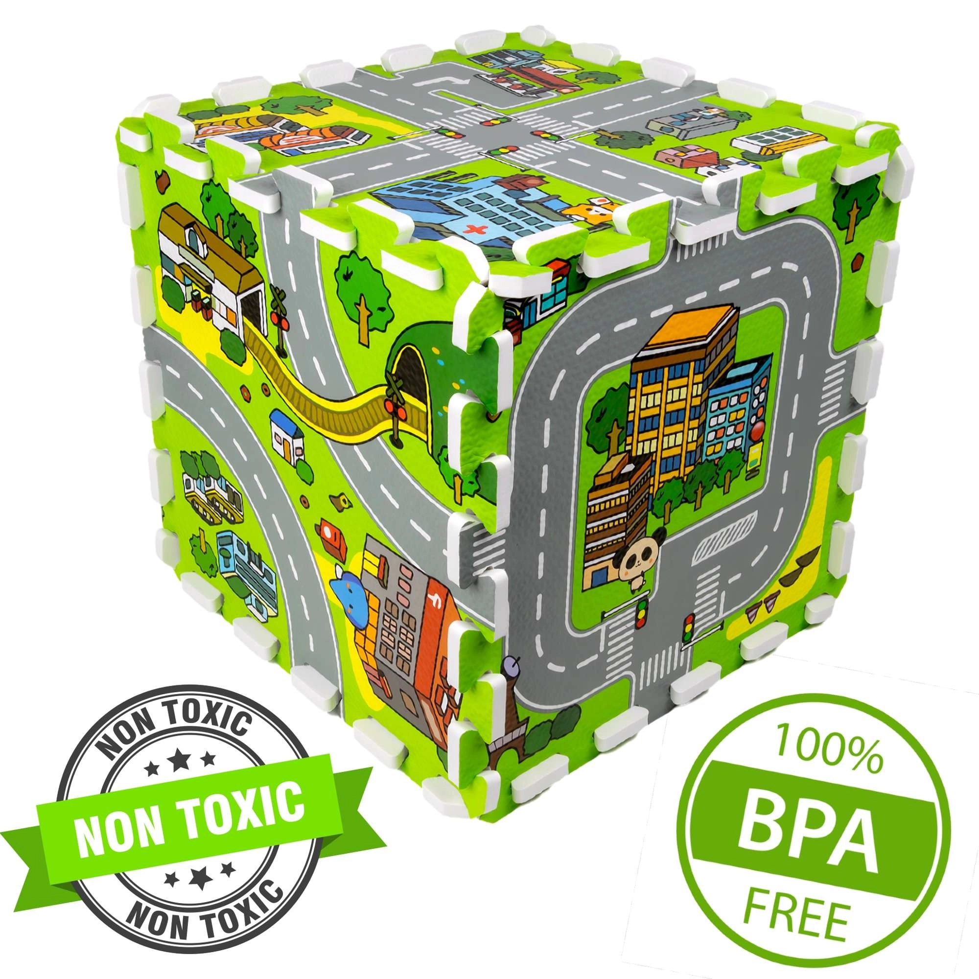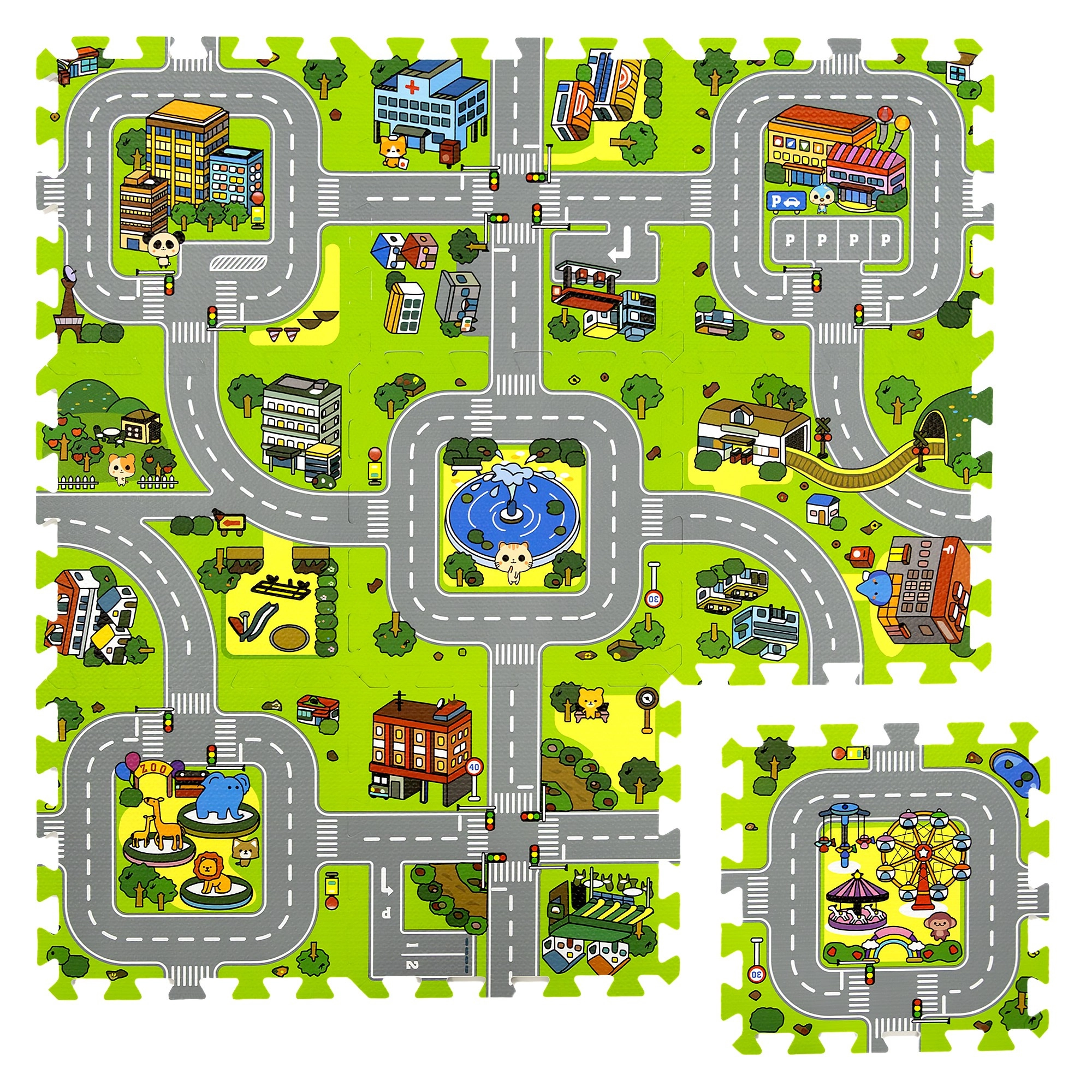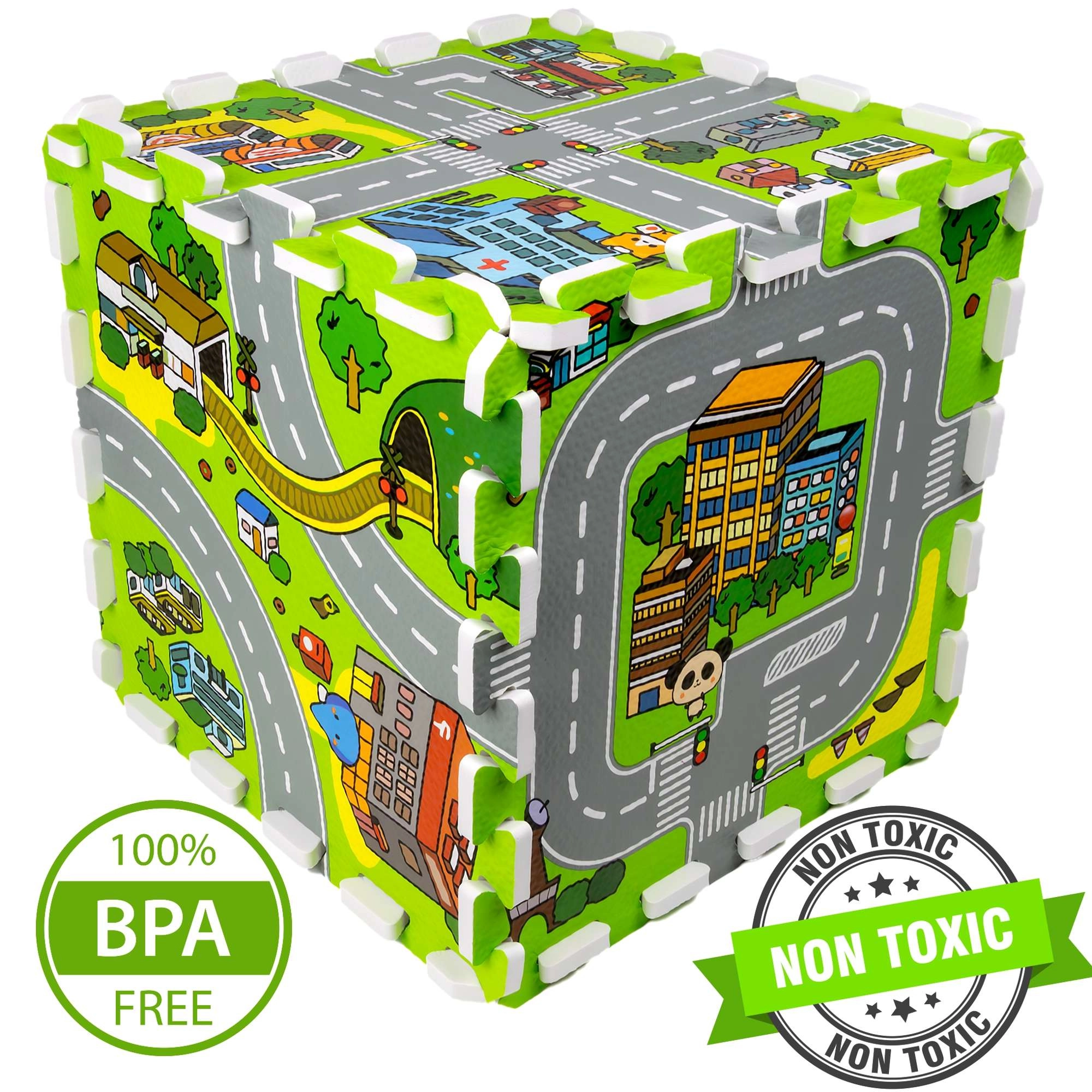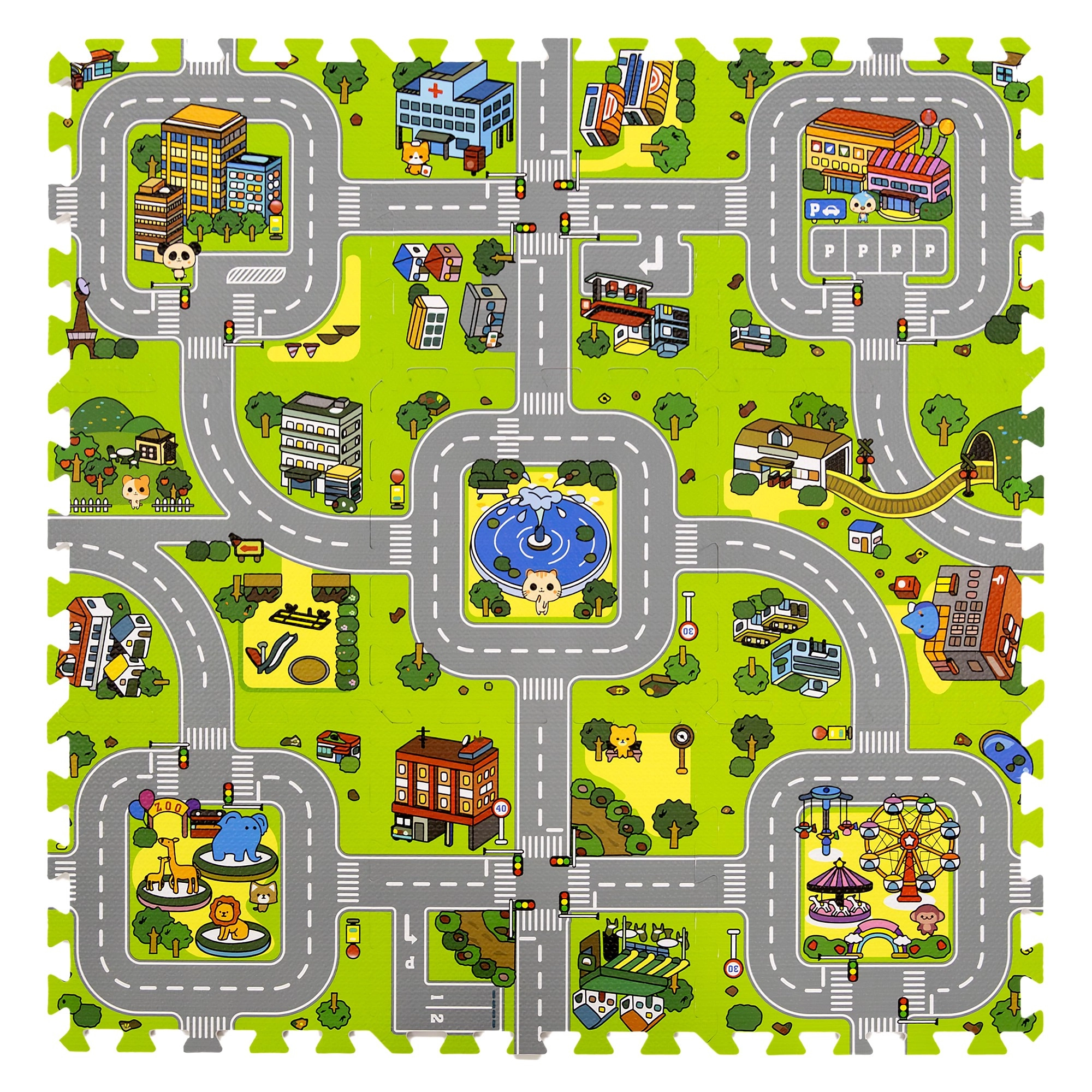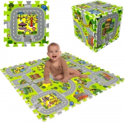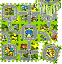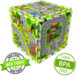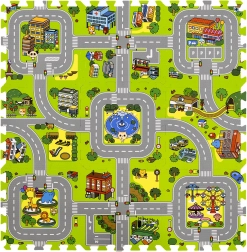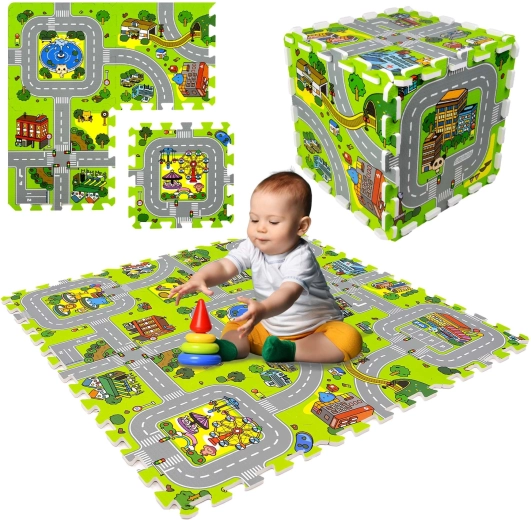 Diese hochwertige Kinder-Schaumstoffmatte mit Stadtmotiv schafft eine weiche und sichere Fläche für Babys und ältere Kinder. Jedes Teil zeigt einen anderen Bereich der kleinen Stadt – Straßen, Park, Zoo, Krankenhaus, Tankstelle und mehr – und eignet sich daher ideal als Spielkulisse für Autos und Figuren. Dank der Stärke von 1 cm dämpft die Matte Stürze, schützt vor Kälte und ist pflegeleicht.