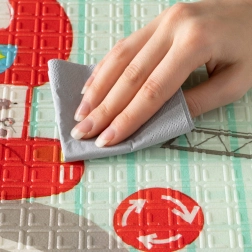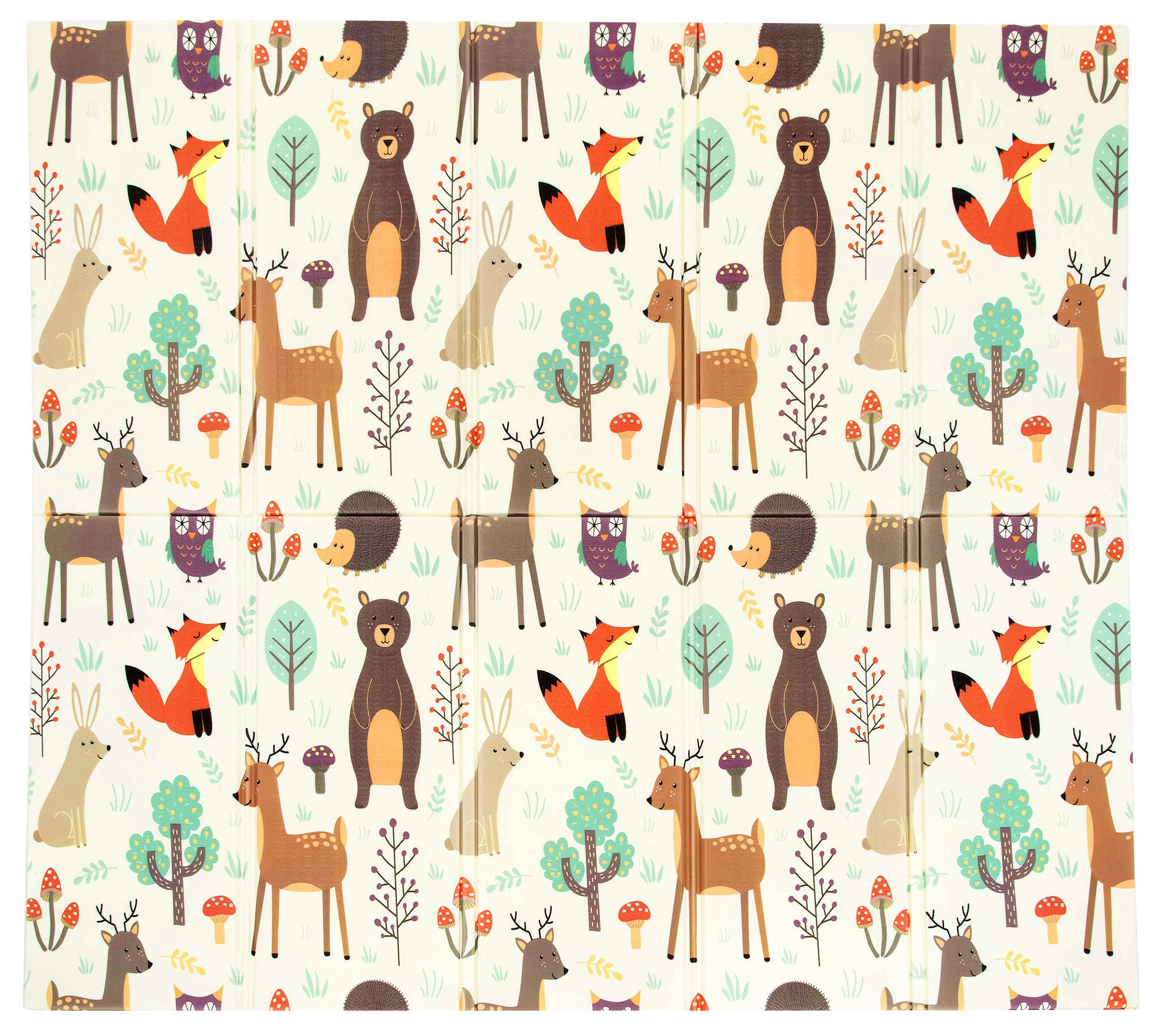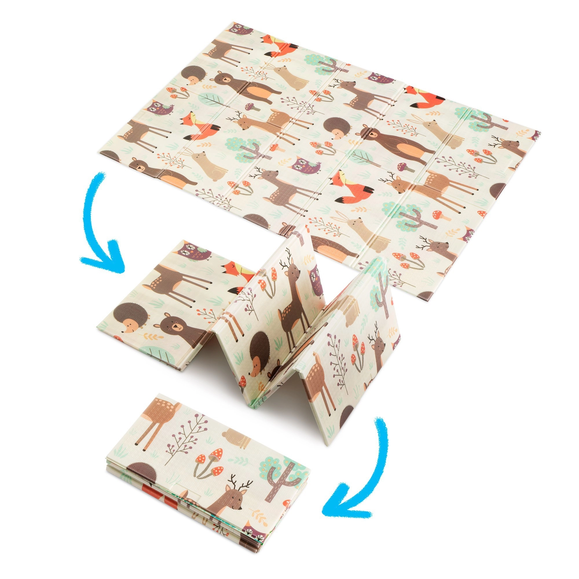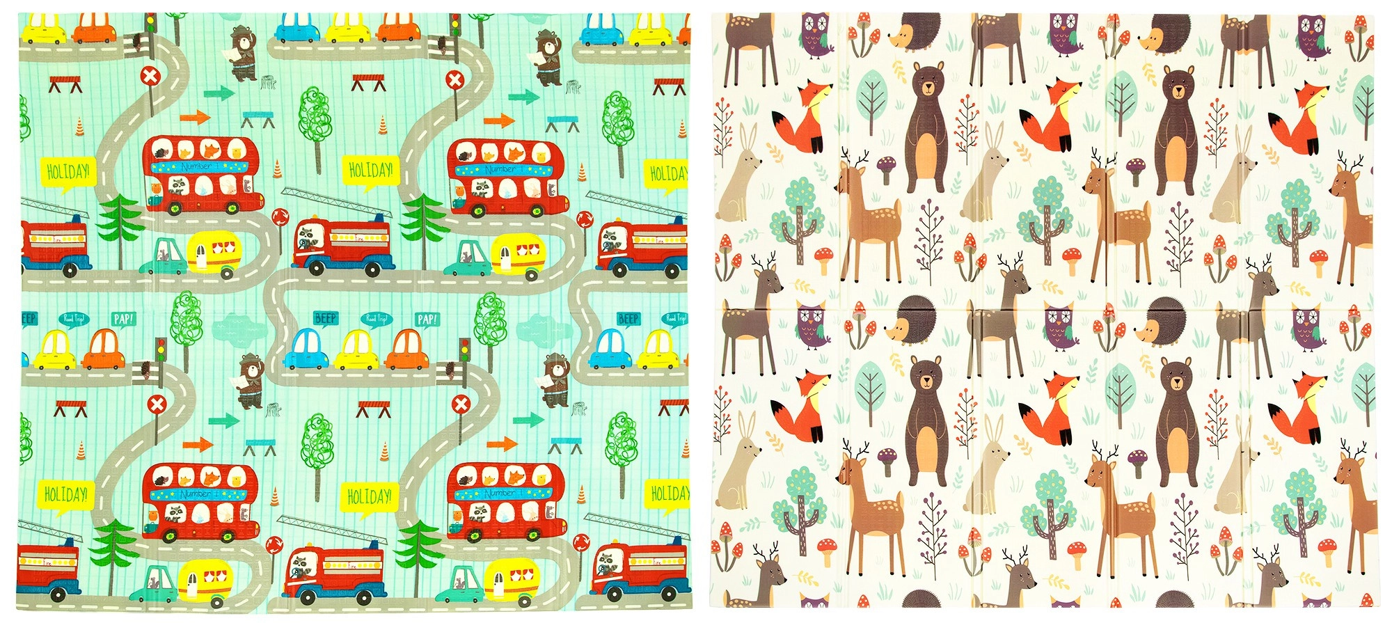 Die Matte ist beidseitig: eine Seite zeigt zarte Motive von Waldtieren, die andere bunte Straßen. Sie lässt sich leicht zusammenfalten, ist leicht und kann dank der Tragetasche mit Reißverschluss und Griffen ins Wohnzimmer, Kinderzimmer sowie in den Garten oder zum Picknick mitgenommen werden. Die wasserabweisende Oberfläche lässt sich einfach mit einem feuchten Tuch abwischen – eine hygienische Lösung, auch für Allergiker geeignet.