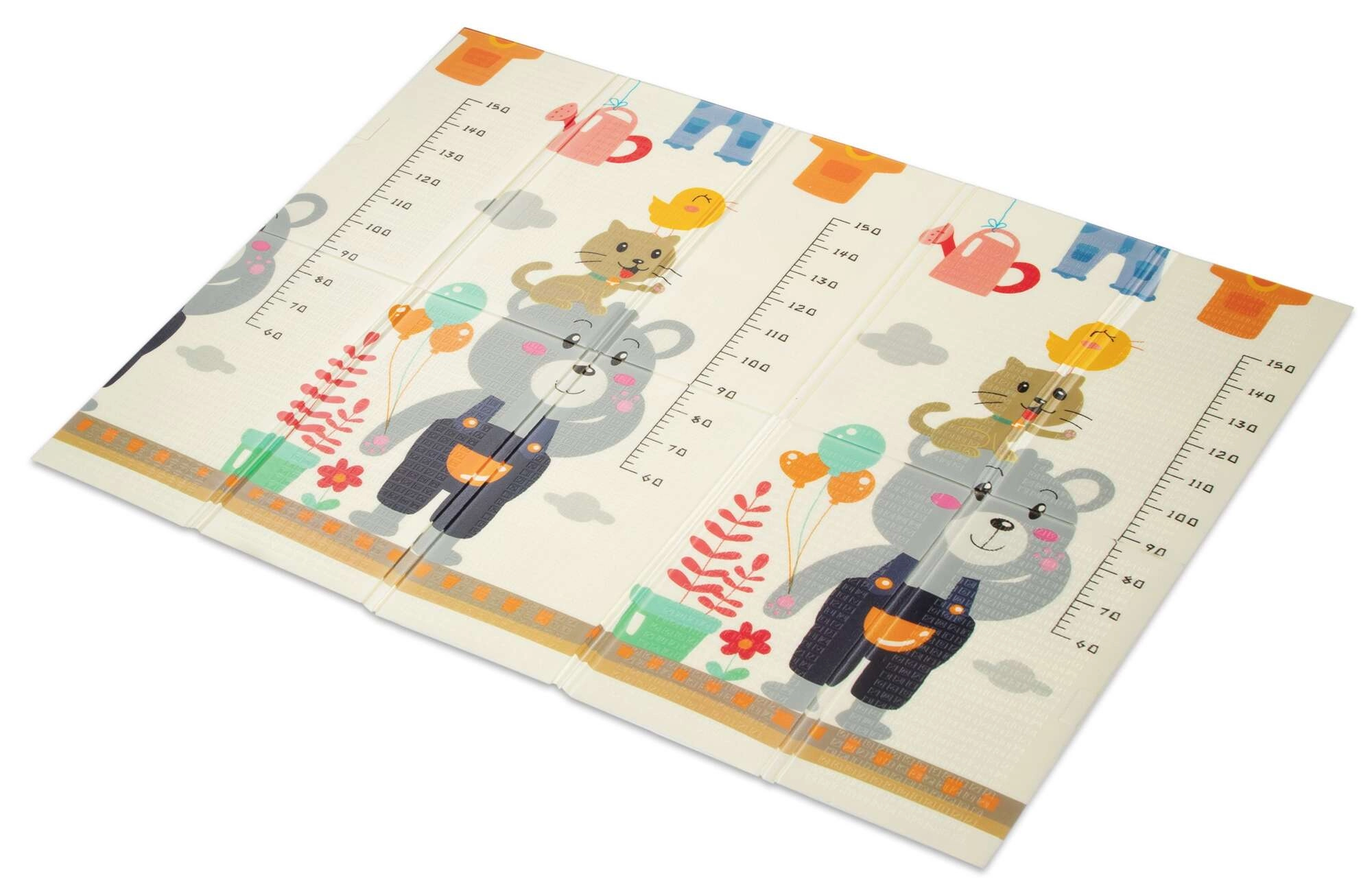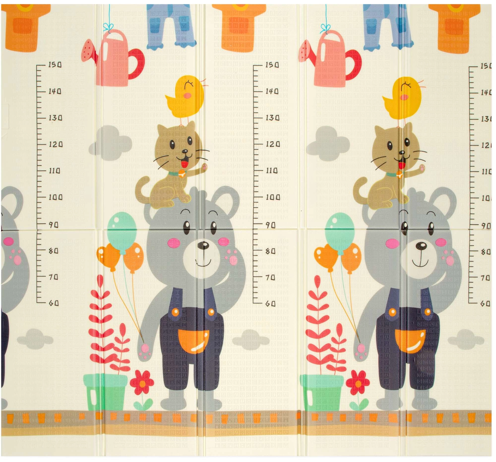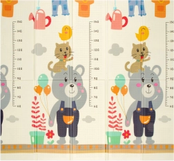 Eine Seite mit niedlichen Tieren und Skala zum Verfolgen des Wachstums, die andere mit Straßen und Autos zur Förderung der Fantasie beim Spielen.