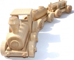 Hochwertiger hölzerner Güterzug aus naturbelassenem Buchenholz. Die Oberfläche des Zuges ist gewachst und poliert, um das natürliche Erscheinungsbild zu bewahren und chemische Behandlungen zu vermeiden.