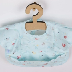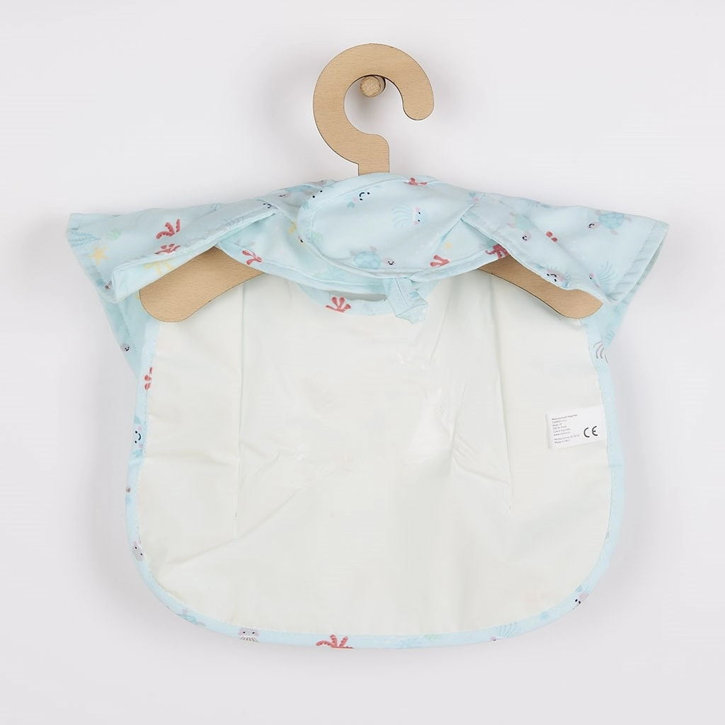 Die Unterseite ist mit einer wasserundurchlässigen Schicht unterfüttert, die ein Durchsickern zuverlässig verhindert. Die aus zwei Materialschichten gefertigte Tasche fängt Krümel und Tropfen auf und hält so die Umgebung sauberer. Bei Verschmutzung genügt es, das Lätzchen mit einem feuchten Tuch abzuwischen oder in der Maschine zu waschen.