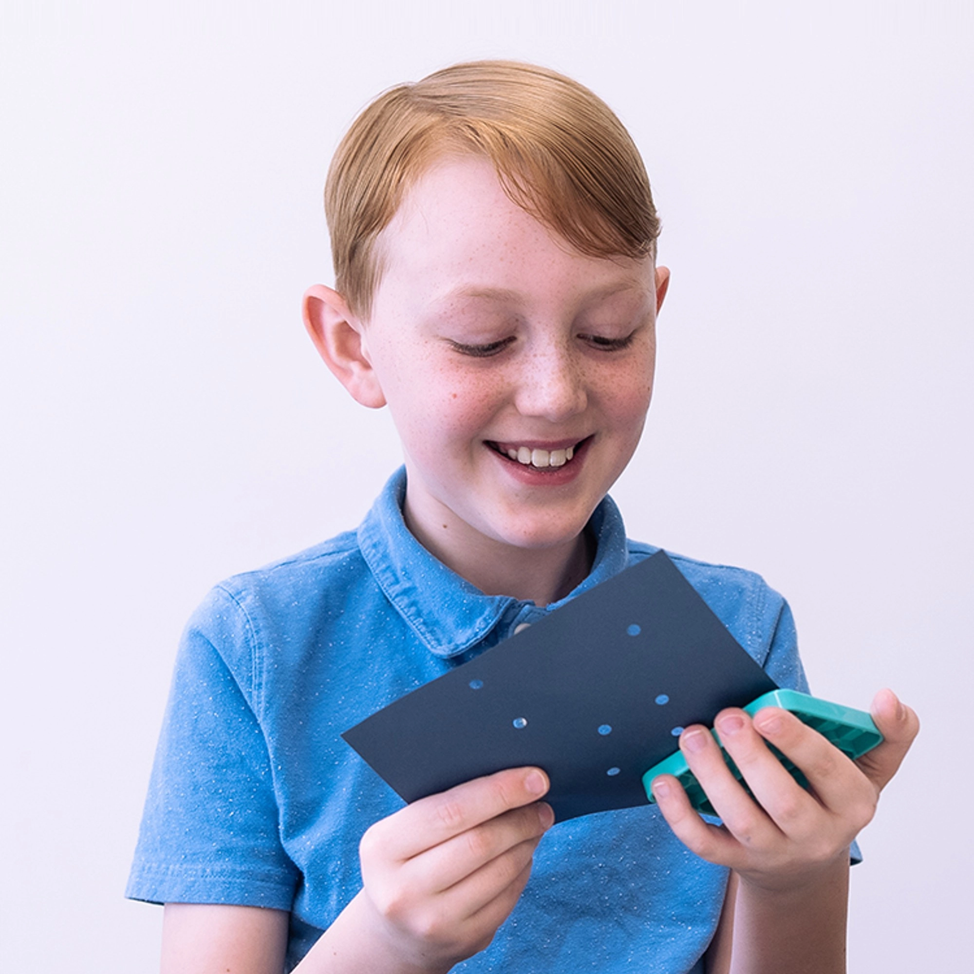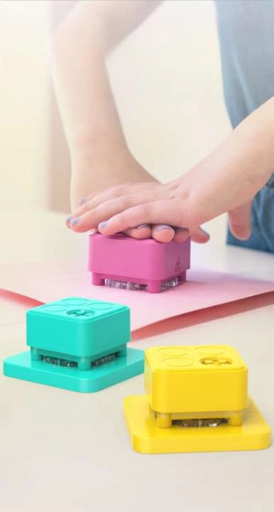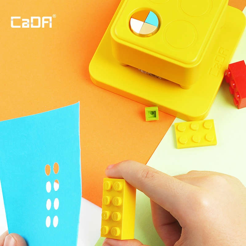 Entdecken Sie kreatives Papierschaffen in Kombination mit Bausteinelementen. Der verstellbare CADA-Locher in Blau ermöglicht Kindern, gleichmäßige Löcher in Schablonen und Karten zu stanzen, die anschließend mit farbigen Bausteinen gefüllt werden. Dank der transparenten Magnetunterlage ist die Arbeit präzise, sauber und sicher.
