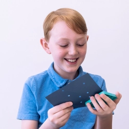 Im Paket finden Sie einen Locher, 99 Bausteine, 2 Schablonen und 6 Karten. Einfach lochen, die Öffnungen mit Bausteinen füllen und ein eigenes Design gestalten.