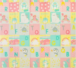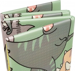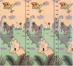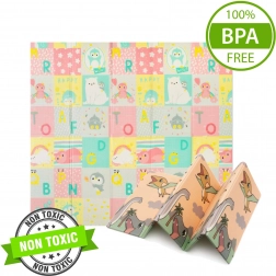 Beide Seiten bieten einen pädagogischen Druck in sanften Pastellfarben: niedliche Dinosaurier mit Höhenmessskala sowie ein Motiv mit Tieren und Buchstaben. Die rutschfeste Prägung unterstützt das sichere Erlernen von Krabbeln und Laufen und fördert gleichzeitig die sensorische Entwicklung. Die Oberfläche ist wasserabweisend und lässt sich einfach mit einem feuchten Tuch abwischen.