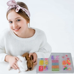 Dieses umfangreiche Set für kleine Designerinnen und Designer bietet alles, was man zur Herstellung individueller Schmuckstücke benötigt. Kinder können Namen aus Buchstabenwürfeln legen, runde und geformte Perlen kombinieren und sie mit dekorativen Blüten und Anhängern ergänzen. Man braucht nur eine Schere zum Kürzen der Schnur und etwas Fantasie.