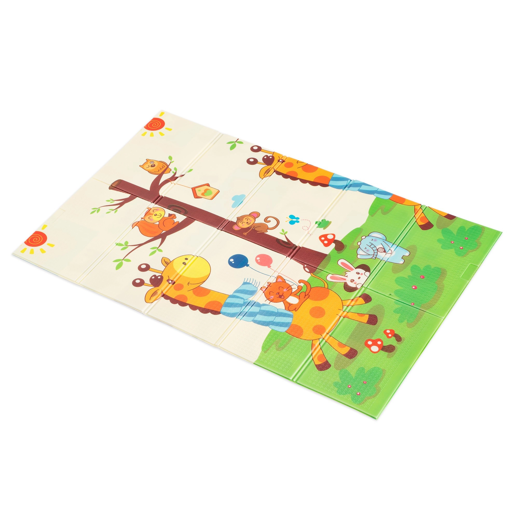 Der XPE-Premiumschaum ist geruchslos, ungiftig und abriebfest. Dank seiner Stärke von 0,8 cm dämpft er Stöße sehr gut und sorgt für Isolation gegen kalte Böden. Beide Seiten sind mit attraktiven Drucken versehen – eine mit niedlichen Giraffen, die andere mit Tieren auf farbigem Hintergrund – und fördern so die visuelle Entwicklung von Kindern.