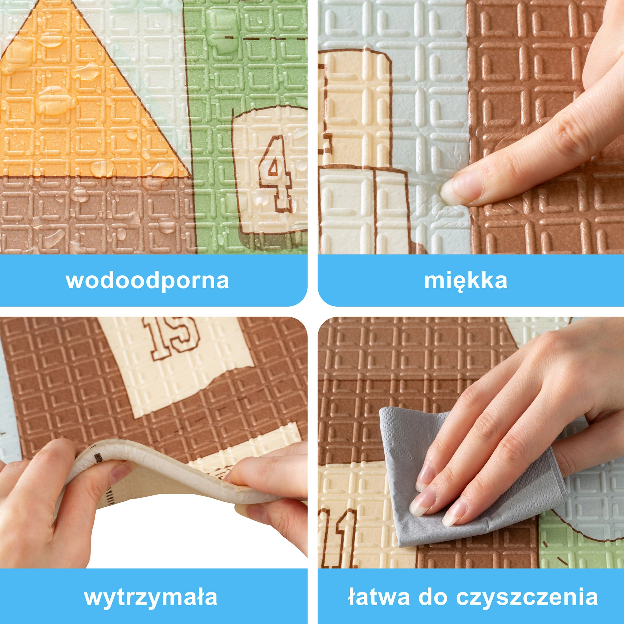 Sicherheit ohne Kompromisse: Der ungiftige XPE-Schaum ist geruchsneutral, frei von Formamid, Phthalaten, PVC und BPA, die Matte trägt das CE-Zeichen und entspricht den strengen europäischen Normen EN71-1, EN71-2, EN71-3 sowie REACH. Geeignet ab Geburt.