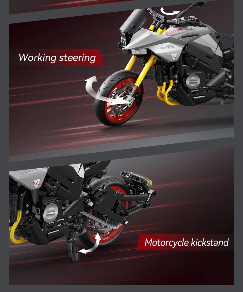 Die detailreiche Replik der legendären SUZUKI Katana begeistert jeden Fan technischer Bausätze. Das Set aus der Reihe Make Your Bricks Move fördert Feinmotorik, Geduld und Vorstellungskraft und bietet zugleich realistische Funktionen, die das Modell zu einem beeindruckenden Sammlerstück machen.