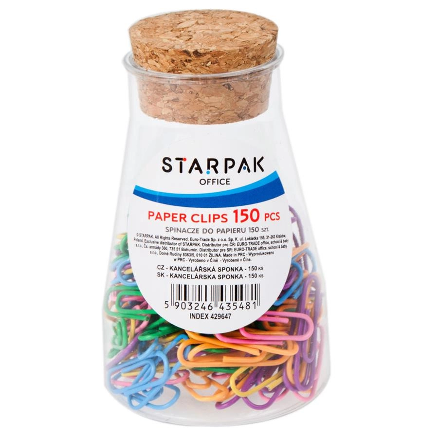 Praktisches Set bunter Büroklammern für die übersichtliche Organisation von Dokumenten. Die Verpackung enthält 150 Stück in einer stilvollen Dose mit Korkverschluss. Ideal für Büro, Schule und Zuhause, robust und wiederverwendbar.