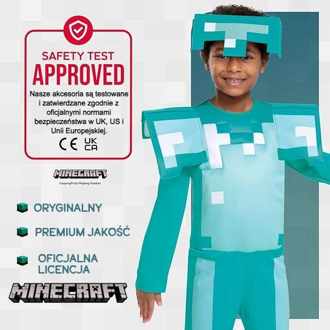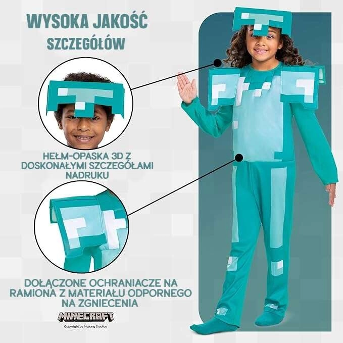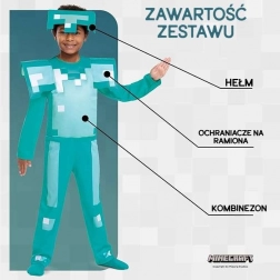 Dieses offiziell lizenzierte MINECRAFT-Diamantrüstungs-Kostüm verwandelt Kinder in Helden ihres Lieblingsspiels. Ein weicher Overall mit Pixeldruck und markanten Schulterpaneelen wird durch einen leichten Helm ergänzt, der dem Kostüm den ikonischen Look verleiht. Dank der angenehmen Materialien ist das Kostüm auch bei längerem Tragen komfortabel.