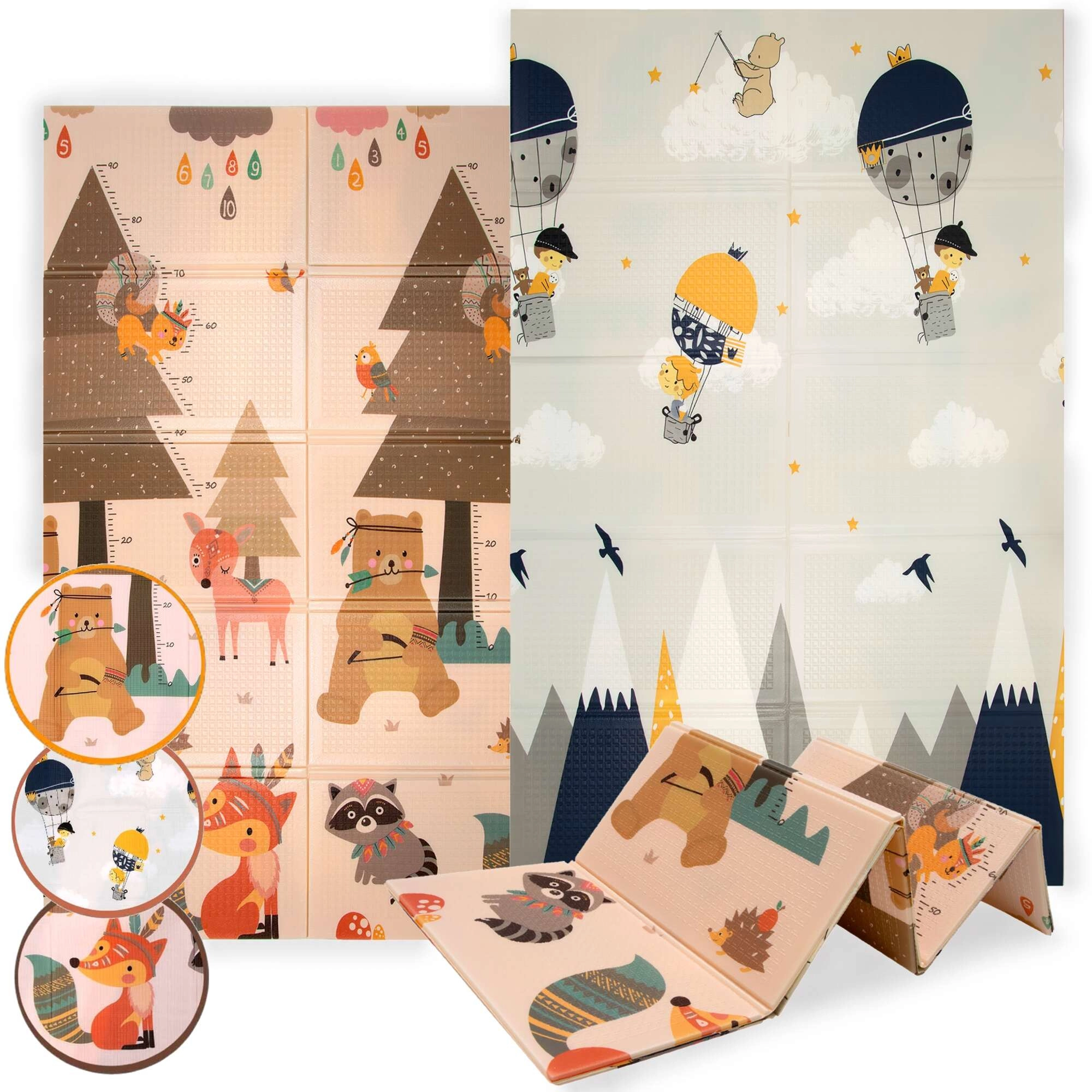 Die HUMBI-Matte aus hochwertigem XPE-Schaum bietet ausgezeichnete Stoßdämpfung, thermische Isolierung gegen kalte Böden und eine rutschfeste, sanft geprägte Oberfläche für sicheres Krabbeln und die ersten Schritte. Sie ist zweiseitig – auf einer Seite niedliche Waldtiere, auf der anderen Berg- und Abenteuer-Motive – so lässt sich der Look leicht an Interieur und Stimmung des Kindes anpassen.