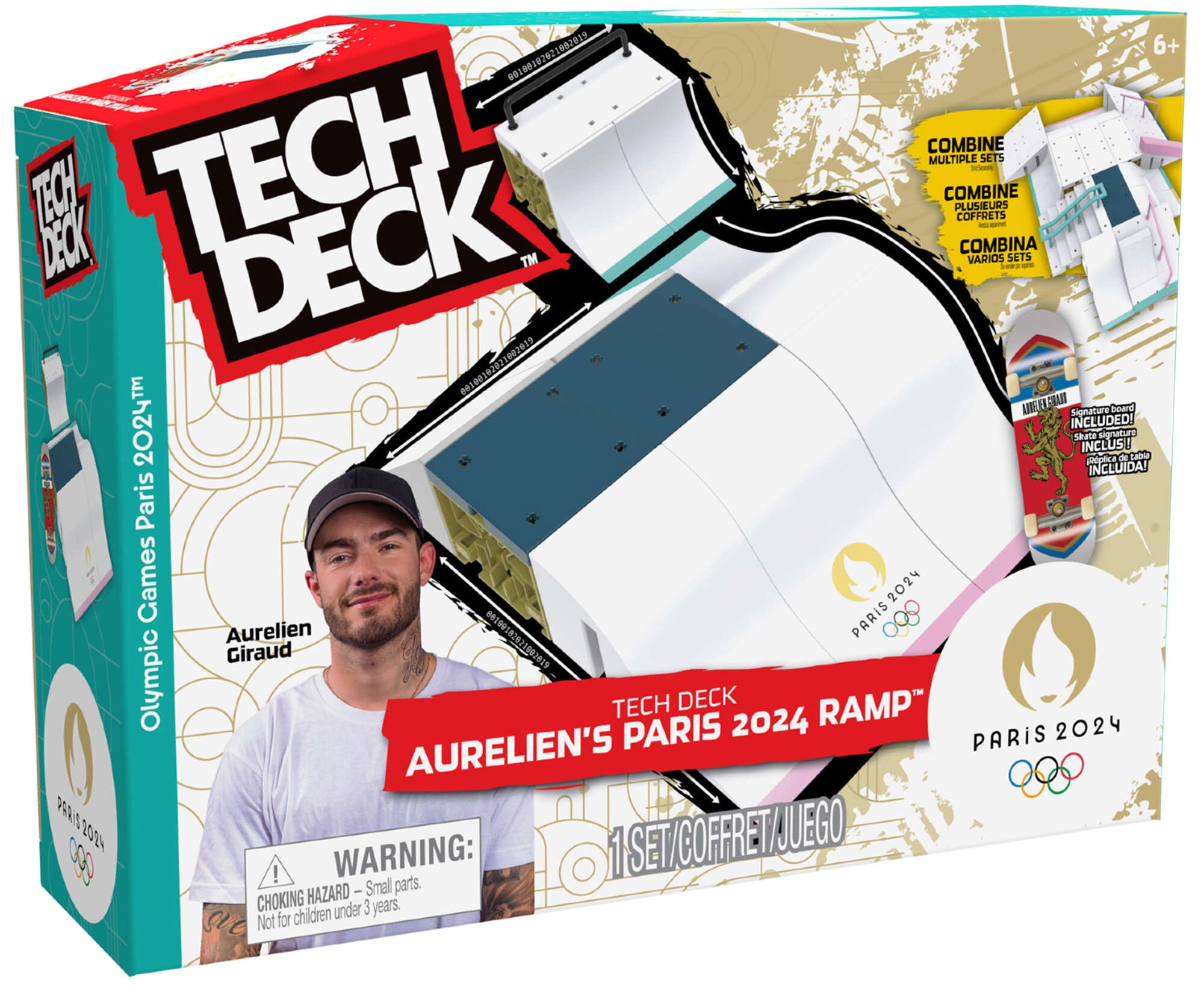 Erlebe die Atmosphäre des olympischen Skateboardings mit dem exklusiven Tech Deck Aurelien Giraud Paris 2024 Set. Robuste Kunststoffteile, Viertelradien, Grind Rail und Plattformen ermöglichen flüssige Line-Kombinationen, Ollies, Grinds und Sprünge – alles auf einem detailliert gefertigten Mini-Deck.